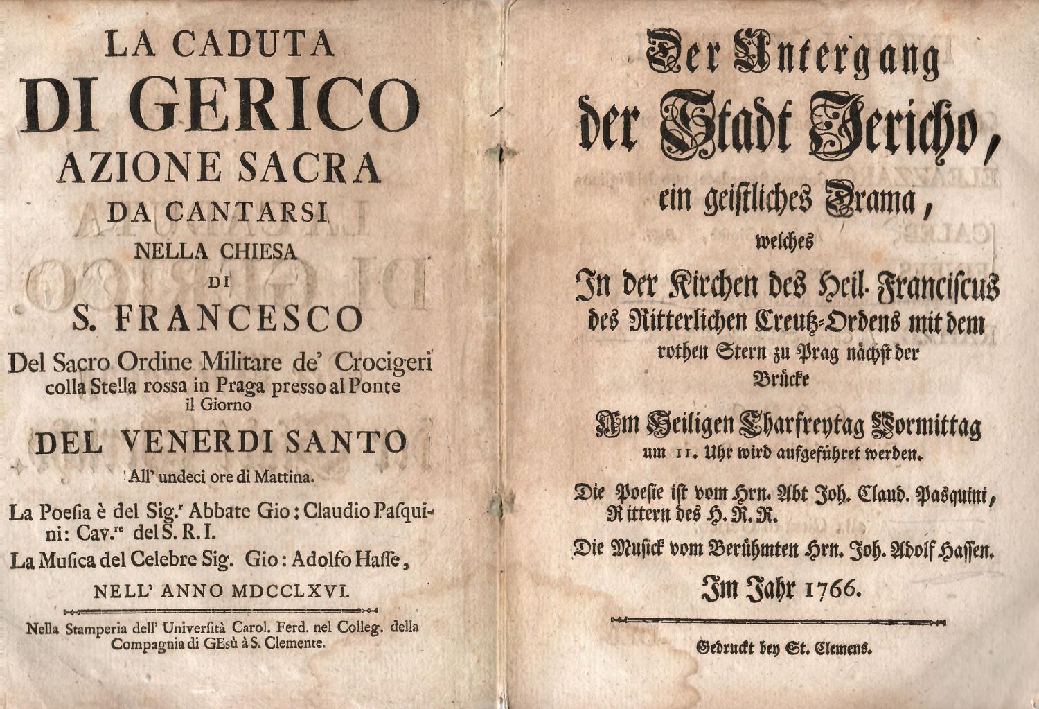 LA CADUTA DI GERICO AZIONE SACRA DA CANTARSI NELLA CHIESA DI S. FRANCESCO Del Sacro Ordine Militare de´Crocigeri colla Stella rossa in Praga presso al Ponte il Giorno DEL VENERDI SANCTO All´undeci ora di Mattina. Der Untergang der Stadt Jericho, ein geistliches Drama, welches In der Kirchen des heil. Franciscus des Ritterlichen Creutz=Ordens mit dem rothen Stern zu Prag nächst der Brücke Am Heiligen Charfreytag Vormittag um II. Uhr wird aufgeführet werden.
