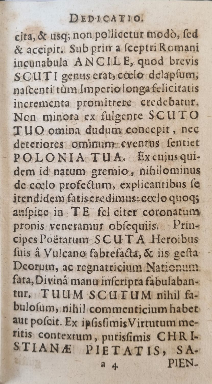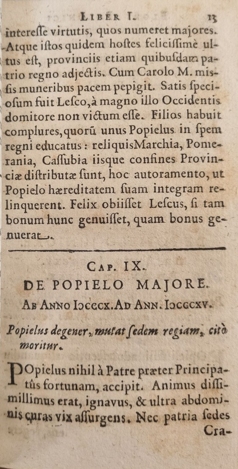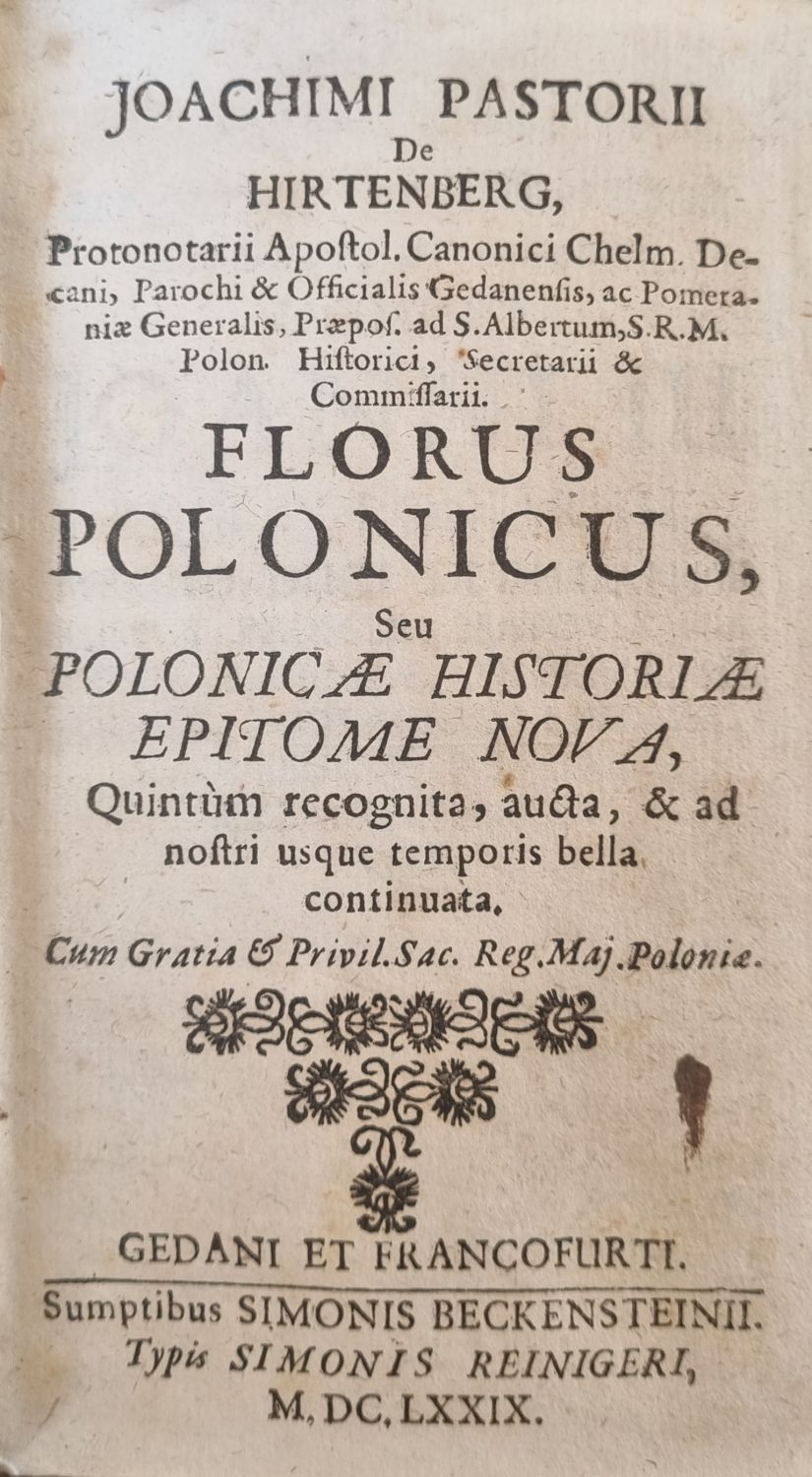 Tištěno antikvou, místy kurzivou, živá záhlaví, tištěné poznámky pod čarou, tučně tištěné versálky ve výši 2-4 řádků, maureskové viněty, viněty se znakem katolické církve, od strany 792 chybná paginace (místo str. 793 pag. 797 a pak chybně až do konce), na straně 649 mezititul "CALENDAE REGIAE eu De auspicatissimo Serenissimi ac Potentissimi Principis ac Domini DNI. JOANNIS CASIMIRI, .....", na str. 705-763 "AURORA PACIS, ....", na str. 765 mezititul "DIADEMA GLORIAE ....", na straně 823 mezititul "AEGIS PALLADIA ... JOANNIS III REGIS POLONIAE". (Báseň na počest Jana III. Sobieského, která vyšla samostatně knižně roku 1676 v Toruni).<Dobová pergamenová vazba, zeleně barvené ořízky. Vazba ohmataná, na zadní desce hnědé skvrny, pergamen v horní třetině hřbetu utržený a též při horním okraji přední desky.<br>Joachim Pastorius von Hirtenberg (20.9. 1611 Glogow - 26.12. 1681 Frombork), byl polský lékař, historik a básník. Působil jako městský lékař a profesor historie na gymnásiu v Elbingu, roku 1656 ho městská rada Gdaňsku jmenovala profesorem historie. Císařem Ferdinandem III. byl povýšen do šlechtického stavu za své zásluhy během několika různých úspěšných diplomatických misí. Stal se dvorním historiografem a královským sekretářem na dvoře Jana Kazimíra Sobieského. Za svůj život několikrát změnil své náboženské vyznání. Původně evangelík, polský bratr, kalvinista, luterán a nakonec roku 1658 konvertoval ke katolickému vyznání a dokonce roku 1675 byl vysvěcen na kněze a od roku 1678 zastával úřad generálního vikáře pro Gdaňské Pomořansko. - Nabízená kniha je jednou z jeho nejdůležitějších prací, vyšla poprvé roku 1641 v Leidenu a jak název napovídá bude k dějinám své země asi přívětivá. Na několika místech se dotýká i historie Českých zemí.