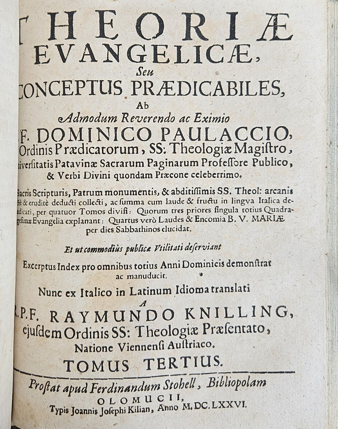 Pumprla P,3406; BCBT 41487 a 41486 (třetí díl neevidují); Zíbrt I, 23145; SKC neeviduje žádný kompletní exemplář. <br>Tisk latinkou, místy italikou, sazba ve dvou sloupcích, živá záhlaví, tištěné poznámky po stranách, na foliu a2 prvního dílu tištěná dedikace hraběti Žerotínovi. Konturové iniciály na rostlinném pozadí zalomené do výše 3-6 řádků, tučně tištěné versálky ve výši 2 řádků, viněty, pásové vlysy z drobného ornamentu. Tři titulní listy, v kolofonu prvého dílu uveden jako nakladatel Vít Jindřich Ettel, druhý díl vyšel roku 1670 u Anny Alžběty Ettelové a třetí roku 1676 u Jana Josefa Kiliana, k dostátní u knihkupce Ferdinanda Stohella.<br>Dobová vazba ze světlé vepřovice zdobené slepotiskem, barvené ořízky, ve hřbetu tři vazy, na přední desce tlačené a černě barvené vlastnické iniciály I.N.C. a datum 1691. Na přední desce dva kovové trny, na desce zadní původní kožené přezky a na přezce spodní původní plechový úchyt. Na tit. listu začerněné jméno jednoho z předchozích vlastníků.
