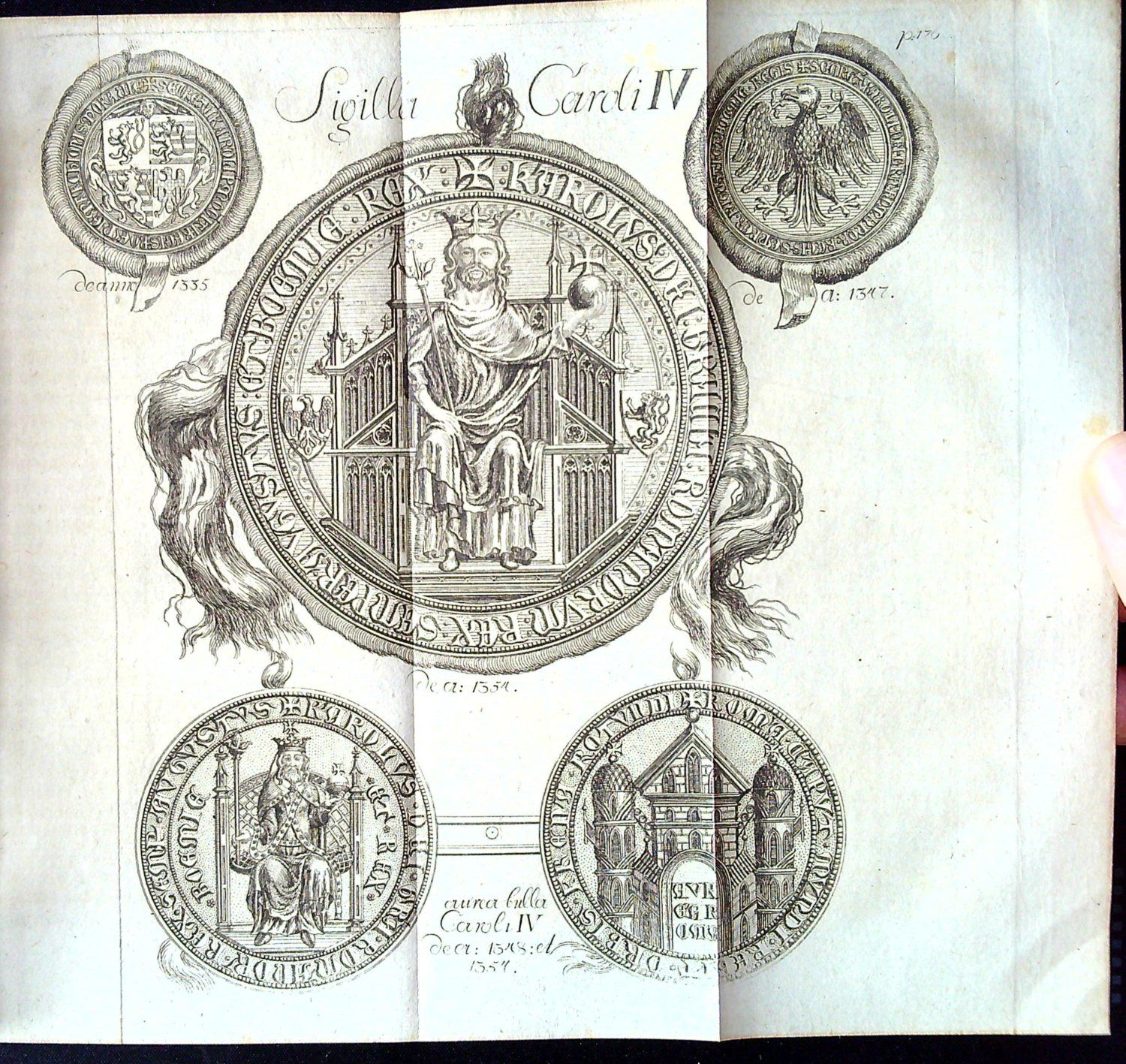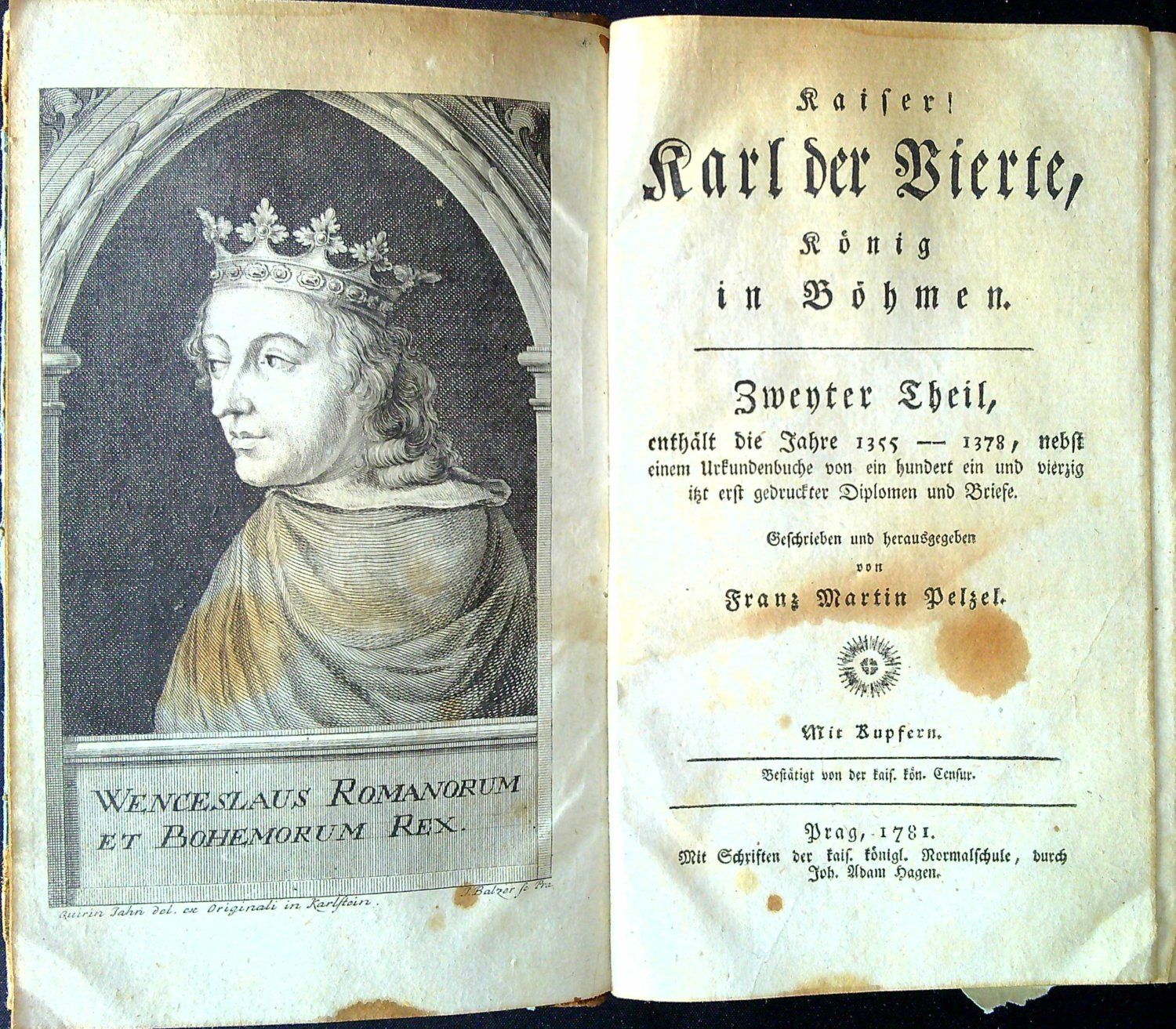 | Ilustrace: | Ve front. 1. dílu mědirytinová podobizna Karla IV. sign. "Nicolaus Wurmser pinxit, J. Quirinus Jahn del., Joann Balzer sc. Pragae", za s. 176 rozkl. mědiryt s vyobr. pečetí, za s. 416 rozkl. příloha s rytou faksimilí rukopisů. Ve front. II. dílu mědirytina s portrétem Václava IV. sign. "Quirin Jahn del. ex Originali in Karlstein, J. Balzer sc Pra.", mezi str. 530-531 rytá příloha s faksimilí rukopisu, mezi str. 558-559 rozkládací mědirytina s pohledem na Karlštejn (Knihopis rytinu neuvádí) , mezi str. 710-711 rozkl. příloha s rytou faksimilí rukopisu. |