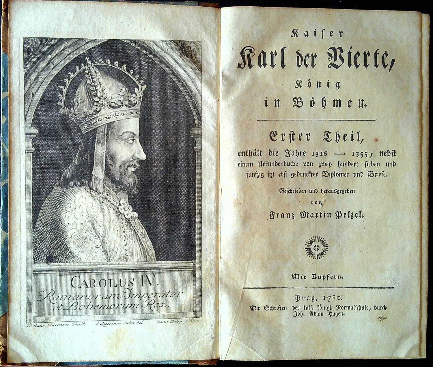 Zíbrt II,12047; Knihopis 6973; Voit 674<br>Německý text a česká slova gotikou, latinský text antikvou, živá záhlaví, tištěné poznámky pod čarou, tučně tištěné versálky, koncová viněta, na straně 3 druhé části prvního dílu mědirytina s vyobrazením pečeti s císařskou orlicí. <br>Dobová vazba s karonovými deskami potaženými mramorovaným papírem s koženým hřbetem a nárožnicemi. Ve hřbetu jednotlivá pole členěna dvojitou zlacenou linkou, ve druhém poli světle hnědý kožený štítek s tlačeným a zlaceným názvem, ve třetím zelený kožený štítek s vyznačením dílu. Na předsádkách dobový olejový papír, na předním vakátu staré německé razítko s knih. čísly. Papír místy zahnědlý, ve druhém dílu na front., tit. listu a prvních pěti listech hnědé skvrny. <br>Životopis císaře Karla IV. z pera Františka Martina Pelcla (1734 - 1801) je doplněn dodnes cennou edicí 349 listin. Druhé vydání knihy vyšlo roku 1783 v Drážďanech.