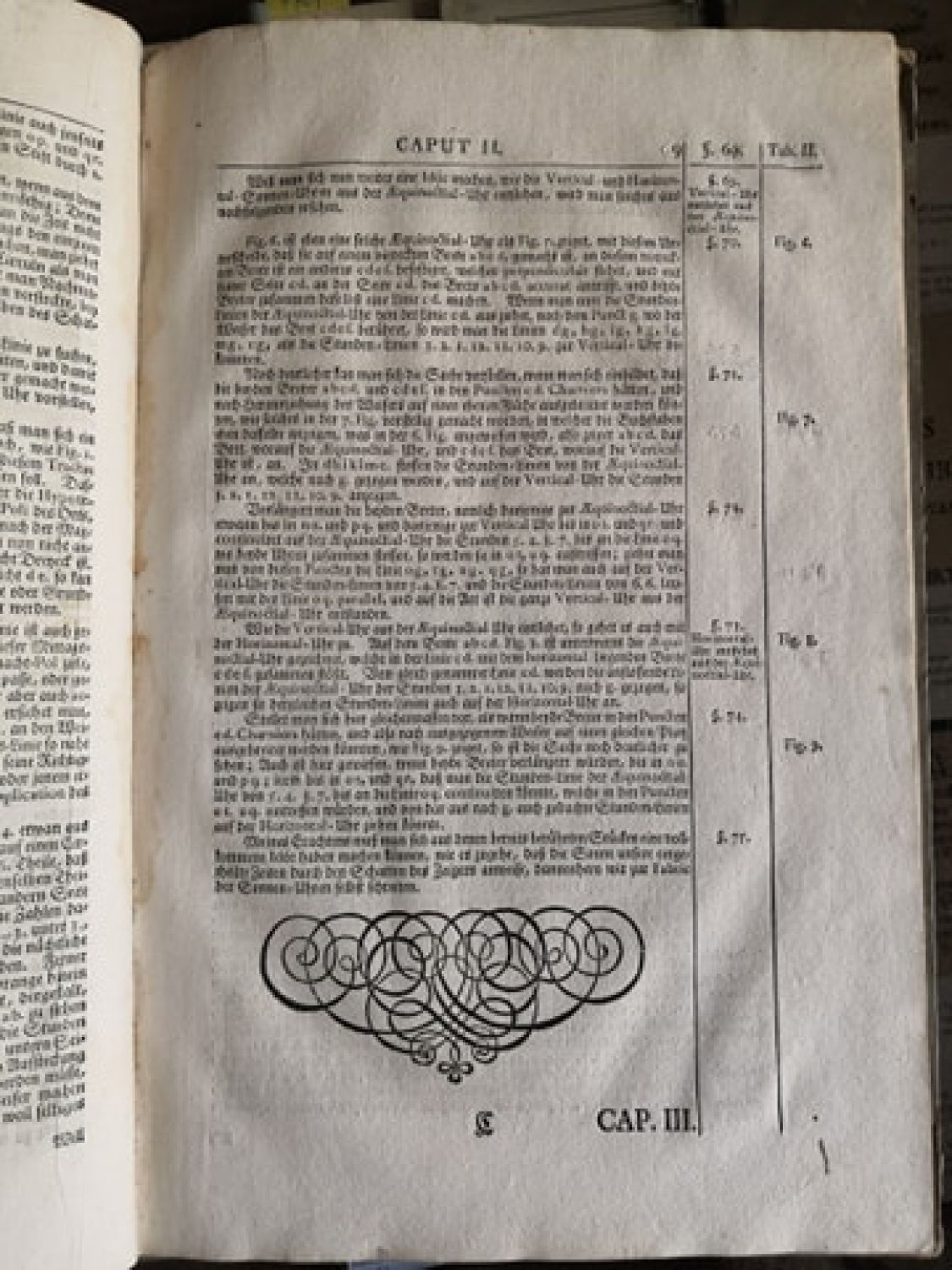 Poggendorff II,400.<br>Mědědyt. front., který dle kresby F. X. Habermana ryl I. G. Hertel, za textem celostr. mědirytina od H. I. Wolffa dle kresby I. A. Corvina s rytým titulem, 15 celostr. mědirytinových tabulí s vyobrazením slunečních hodin, výpočtů a dalších věcí týkajících se měření času. Text gotikou, latinská slova antikvou, živá záhlaví, tištěné poznámky po stranách ve sloupci lemovaném jednoduchými linkami, mimo sloupec tištěné odkazy na přílohové tabule, pásové vlysy, iniciály ve výši 3-4 řádků, viněty.<br>Dobová kartonová vazba, zašpiněná a místy odřená, při horním i spodním okraji hřbetu potrhaná, chybí též pap. pokryv při spodním okraji v délce cca 5 cm, na tit. listu staré razítko, na několika listech stopy po červotoči.<br>Johann Friedrich Penther (17.5. 1693 Fürstenwalde - 17.9. 1749 Göttingen) matematik, ekonom, vysokoškolský profesor, stavitel a jeden z předních teoretiků architektury první poloviny 18. století. Nabízená kniha pojednává o konstrukci a způsobu využití slunečních hodin.