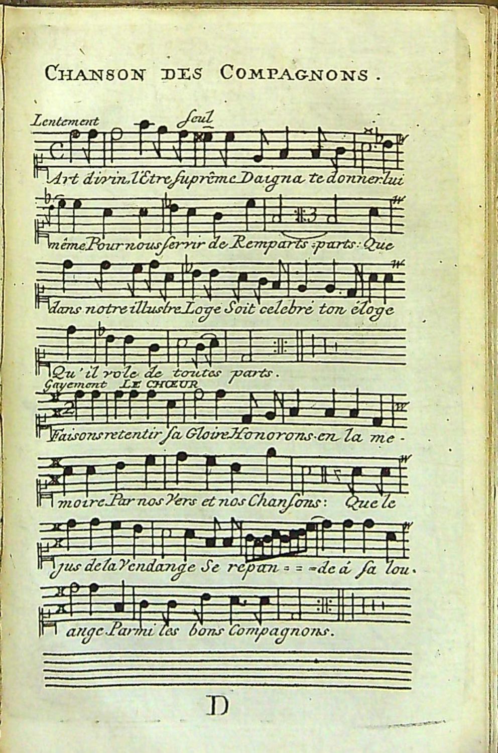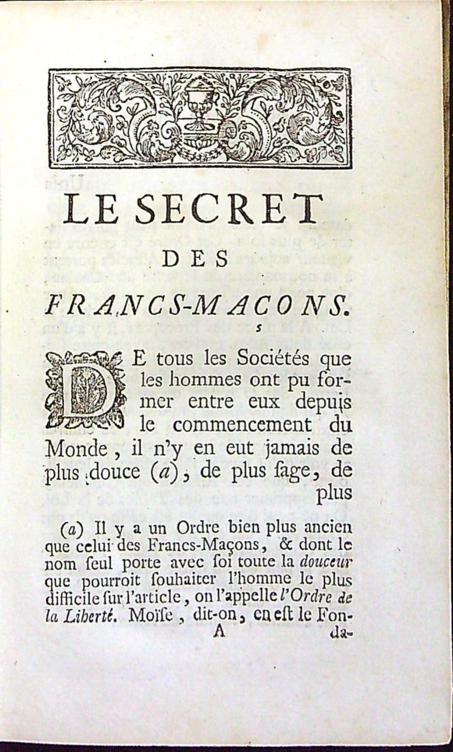 Wolfstieg 29963; Caillet 8506<br>Pásové dřevorytové vlysy, plné i konturové iniciálky na ilustr. pozadí zalomené do výše 4 řádků, viněty se zednářskou symbolikou, pásové lišty z ornamentů. Na nepaginované straně 113 mezititul "Supplement au secsret (sic!) des Francs-Macons", na nepagin. straně 199 mezititul s mědirytinou mompse "Le secret des Mopses revele". Za stranou 240 samostatně číslovaná poslední část s tit. listem "Chansons de la tres-venerable confrerie des Francs-Macons, precedées de quelques pieces de poésie", ve které je pět rytých příloh s celostr. notací a texty písní.<br>Dobová pergamenová vazba, ohmataná a zašpiněná, přes horní okraj hřbetu přelepen modrý pap. štítek se starým knih. číslem, barvené ořízky. Na tit. listu staré razítko zednářské lóže "Velká zemská lóže německých zednářů Berlín".<br>Gabriel Louis Calabre Pérau (1700 Semur-en-Auxois - 31.3. 1767 Paříž) francouzský literát, převor na Sorbonně, nazýval se opatem, ve skutečnosti neměl kněžské svěcení. Jak název nabízeného díla napovídá, jedná se o proti zednářský pamflet autora, které se o zednářství zajímal, ale nebyl nikdy zasvěcen, a tak z pomsty publikoval nabízenou práci, která je však i přesto zdrojem dokumentárních informací o počátcích zednářství ve Francii v prvních desetiletích 18. století.