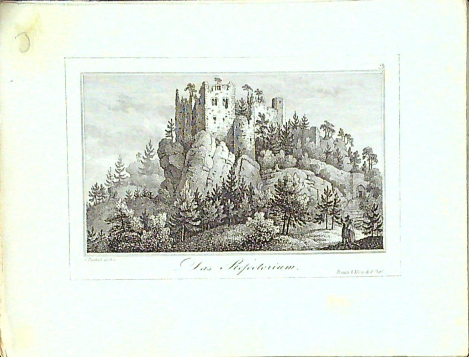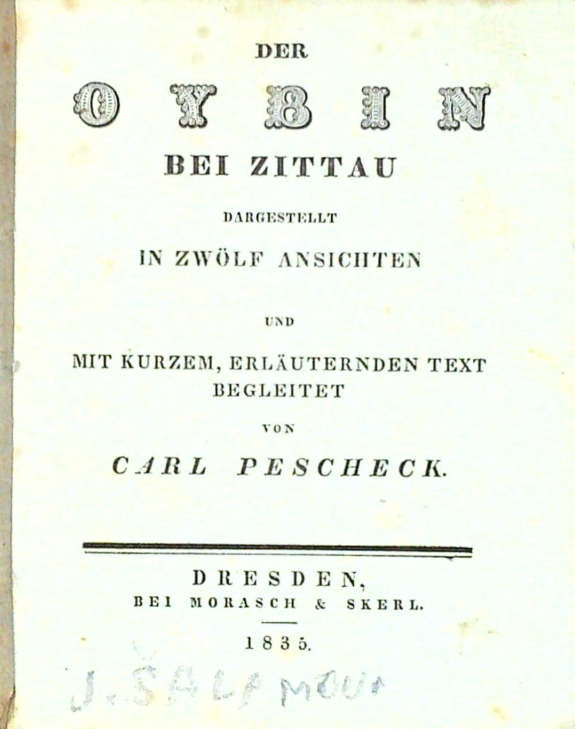 Tištěno antikvou, za titulní listem úvodní slovo vydavatelů, na straně 5-8 stručná historie Oybína od C. Peschka, na str. 9-13 doprovodný text k rytinám, na posledním listu seznam knihy vydaných Moraschem a Skerlem. - Původní ochranný kartonový přebal, ve kterém je volně vložený šitý a pův. pap. páskou ve hřbetu přelepený tištěný doprovodný text a 14 listů rytin. Původní zelené kartonové pouzdro, na přední jeho straně nalepený světle zelený list s názvem a impresem. Pouzdro (rozměr 130 x 100 mm) při hranách lehce odřené. Podpisy tužkou Jiřího Šalamouna.<br>Carl Justus Ludwig Pescheck (1803 - 1847) malíř, potomek českých pobělohorských emigrantů. - Hrad Oybin (Ojvín) rozsáhlá zřícenina středověkého hradu, kláštera a gotického kostela na kopci stejného jména u Žitavy a cca 2 km od české hranice. Hrad byl rozšířen Jindřichem z Lipé, který z něj učinil nedobytnou pevnost, od roku 1346 náležel české koruně. Karel IV. v roce 1364 nechal vybudovat císařský palác, který využíval jako odpočinkové sídlo. Roku 1366 započal ve spolupráci s pražskou dílnou Petra Parléře se stavbou kostela, který byl dokončen roku 1384, roku 1369 tam také založil klášter celestýnů. V době husitských válek byla na hradě ukryta část svatovítského pokladu, hrad byl několikrát husitskými vojsky obléhán, nikdy však nebyl dobyt. Roku 1577 udeřil do kostela blesk a v důsledku toho vyhořel, od té doby začal celý komplex chátrat. Ke znovu objevení místa došlo během romantismu v 19. století zásluhou malířů Caspara Davida Friedricha a Carl Gustava Caruse, kteří zde vytvořili řadu obrazů.