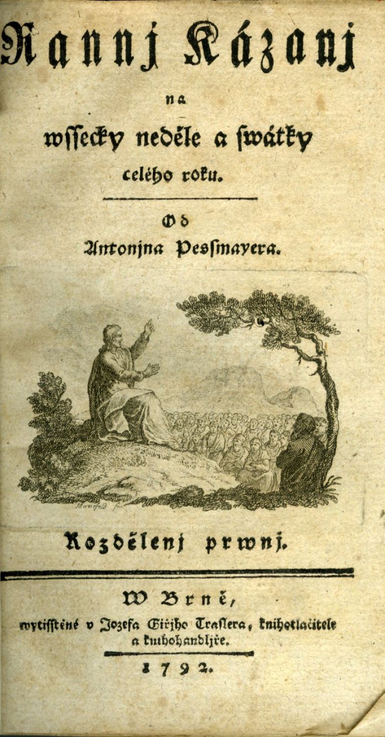 Knihopis 7011<br>Český text gotikou, signatury, stránkové kustody, arabské číslování stran při horním vnějším okraji, živá záhlaví, plné iniciálky ve volném prostoru ve výši 2 řádků, na tit. listu měděrytina sign. Mansfeld zobrazující Ježíše, který káže lidu, rokokové dvoj= a trojlinky, poznámky pod čarou.<br>Dobová kartonová vazba, při horním okraji hřbetu dobový štítek se jmenným a věcným názvem, vazba ohmataná a odřená, při dolním okraji hřbetu potrhaná, v textu tu a tam cestičky způsobené červotočem<br>Antonín Pessmayer, katolický kněz a kazatel, koncem 18. století působil v Brně.