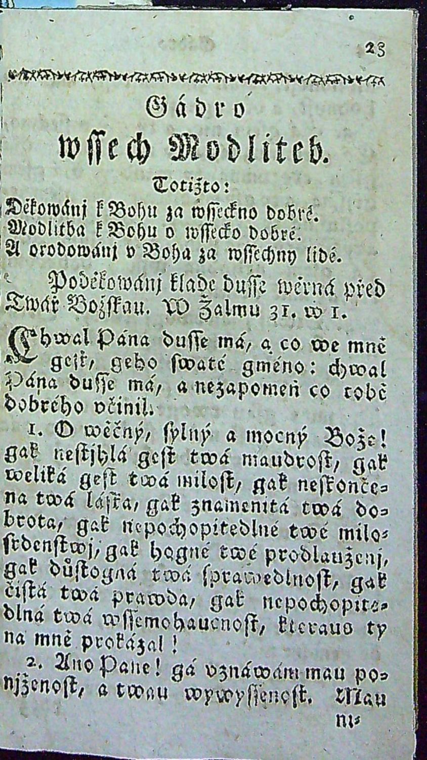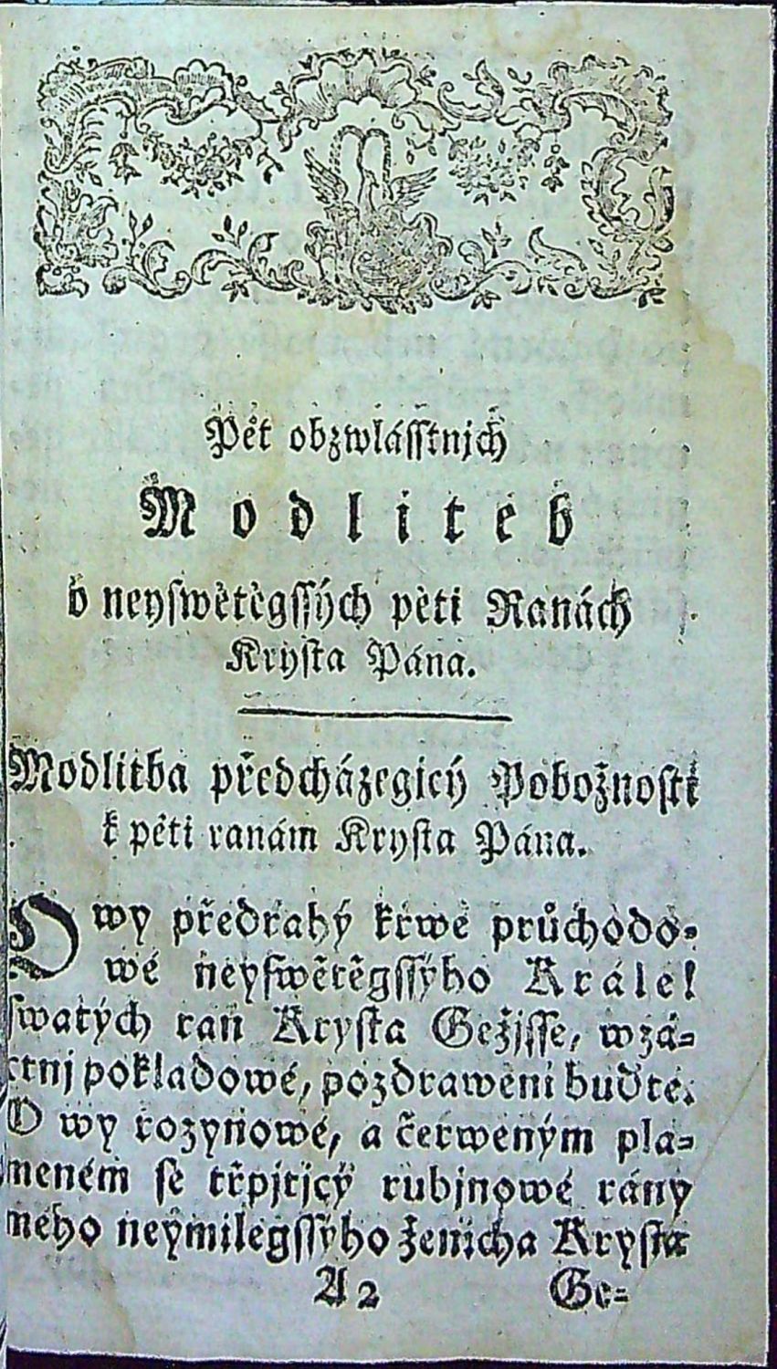 Pět čerwených Korálů, aneb: srdečné a litostiwé rozgjmánj pět Ran Krysta vkřižowaného a prawého Muže Bolesti, k njmžto připogené sau Gádro wssech Modliteb, Modlitby Rannj, Wečernj a při Mssy swaté před a po Zpowědi, před a po Přigjmánj Wlebné Swátosti Oltářnj, patnácté Modliteb o pěti ranách Pána Krysta, Hodinky o sedmi bolestéch Panny Marye, Letannye k Pánu Gežjssy, a k SS. Patronům, a giné wraucné Modlitby ku Potěssenj horliwých Dussy wydané. pro osobu Ženskau.