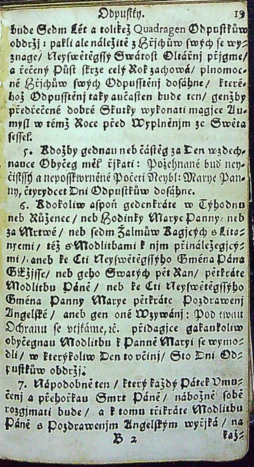 Knihopis 14704a (eviduje 1 ex. v Muzeu Náchodska)<br>Tištěno švabachem, latinská slova antikvou, živá záhlaví, rubriky, maltézské křížky, žaludy, plné iniciálky propletené úponky zalomené do výše 2-5 řádků, pásové vlysy, ozdobné tyče z drobného ornamentu, v záhlaví str. 228 pásová lišta z ornamentů (mezititul "Hodinky Wětssý za Mrtwé"), na str. 300 viněta, na str. 301 mezititul "Nowý Spůsob/ Kterak se pomáhati může Dussyčkám z Očistce". <br>Dobová vazba z černé hověziny, na obou deskách tlačený ozdobný rám, na přední desce uvnitř rámu zrcadlo s křížem a svatozáří, na desce zadní uvnitř rámu prolamované zrcadlo s kalichem, křížem a kotvou, ve hřbetu tři vazy, jednotlivá pole dělená zlacenou ozdobnou lištou, barvené ořízky. - Přední deska vazby v horní části v délce cca 5 cm od knižního bloku odtržená, knižní blok oříznutý (impresum zčásti oříznuté), chybí folio )(1; str. 145-6, strany 321-333 (modlitby, které jsou kaligraficky dopsány hnědým perem) a poslední dvě nečísl. strany. Exemplář se liší od čísla evidovaného v Knihopisu pod číslem 14704 impresem na tit. listu s uvedenými tiskařskými údaji.