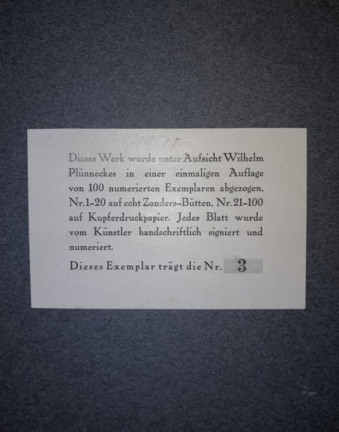 Exemplář číslo 3 z 20 výtisků na pravém Zandersu (exempl. č. 21-100 byly tištěny na mědirytinovém papíru). Každý list je autorem vpravo dole tužkou podepsán a datován, vlevo dole tužkou číslo tisku. Deset listů o celkovém rozměru papíru 62 x 51 cm. Původní kartonová vazba s plátěným hřbetem, na přední desce původní litografie. Přední deska mírně zašpiněná, spodní okraj hřbetu lehce natržený, grafické listy ve stavu velmi dobrém. Na rubu přední desky nalepen původní štítek s tiráží. Na zadní straně vazby chlopně ve kterých jsou volně vloženy grafické listy.<br>Wilhelm Plünnecke (1894 Hannover - 1954 Stuttgart), německý malíř, grafik a ilustrátor. Studoval u Emila Orlika v Berlíně a později na akademii v Lipsku. Byl členem "Hannover Sezession".
