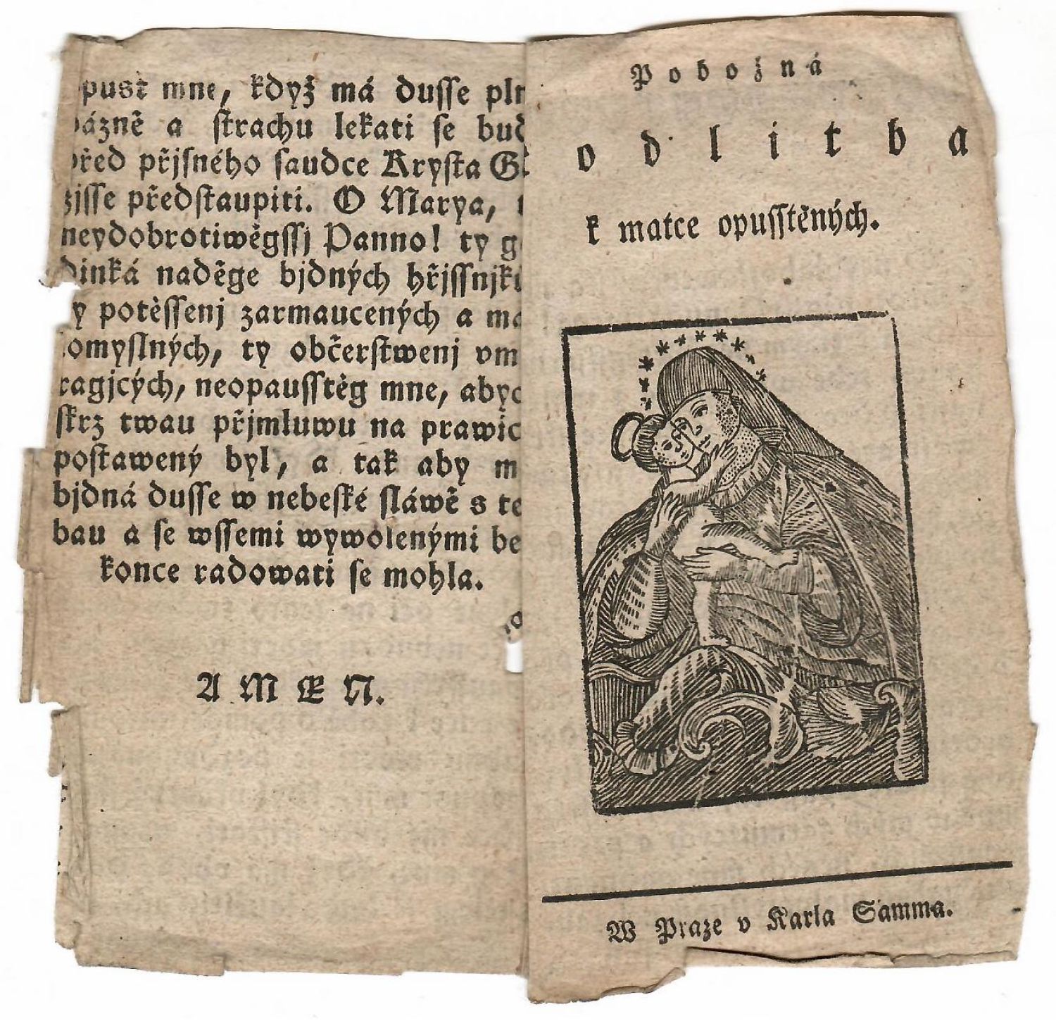 Knihopis č. 5764 eviduje 3 exempláře datované v impresu 1786 (námi nabízený ex, bez datace v impresu).<br>Tištěno švabachem, stránkové kustody, na titulním listu dřevoryt v jednoduchém rámečku (75 x 52 mm) s vyobrazením Marie s Jezulátkem v náruči, impresum odděleno jednoduchou linkou, na rubu prvního listu v záhlaví lišta z ornamentů. - Původní dvoulist při vnějších okrajích pomačkaný a místy potrhaný, druhý list při vnitřním okraji proděravělý (cca 0,5 x O,5 cm).