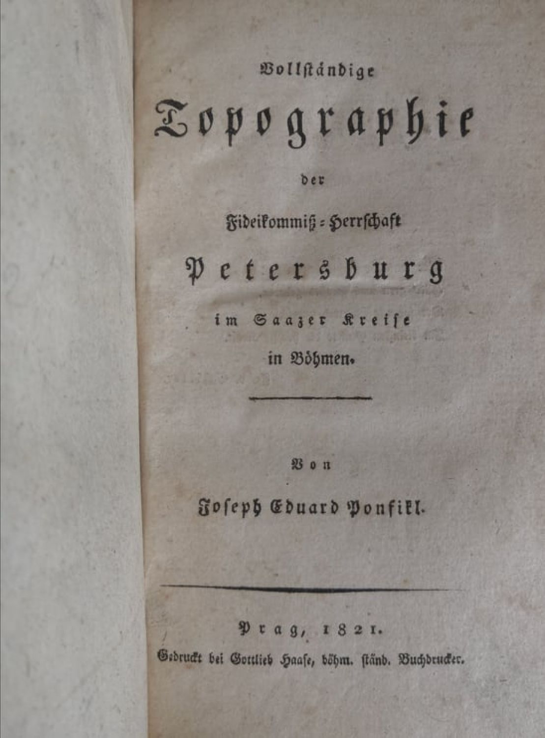 Německý text gotikou, latinský antikvou, signatury, stránkové kustody, v úvodu tištěná dedikace hraběti Johannu Rudolfovi Černínovi z Chudenic. - Dobová kartonová vazba potažená mramorovaným papírem, při horním okraji hřbetu červený kožený štítek s tlačeným a zlaceným názvem, jednotlivá pole členěná jednoduchou zlacenou linkou. Vazba ohmataná a místy odřená, na předním přídeští nalepeno exlibris s iniciálami ZMZ (Na předním přídeští nalepeno ex libris s iniciálami ZMZ (Zdeněk Maria Zenger, byl právník, památkář, grafik, fotograf a významný heraldik. Vytvořil i řadu ex libris). Ve stavu dobrém.<br>Velmi vzácná monografie obce Petrohradu blízko města Loun. Název obce se odvozuje od jména Petra z Janovic, který byl majitelem zdejšího panství v letech 1358-1371 a který je považován za zakladatele zdejšího hradu. Pozdější majitelé Libštejnští z Kolowrat začali pod hradem budovat roku 1559 renesanční zámek, od roku 1622 až do roku 1945 byl zámek v držení rodu Černínů. Dnes je v zámku psychiatrická léčebna a z původního hradu zřícenina.