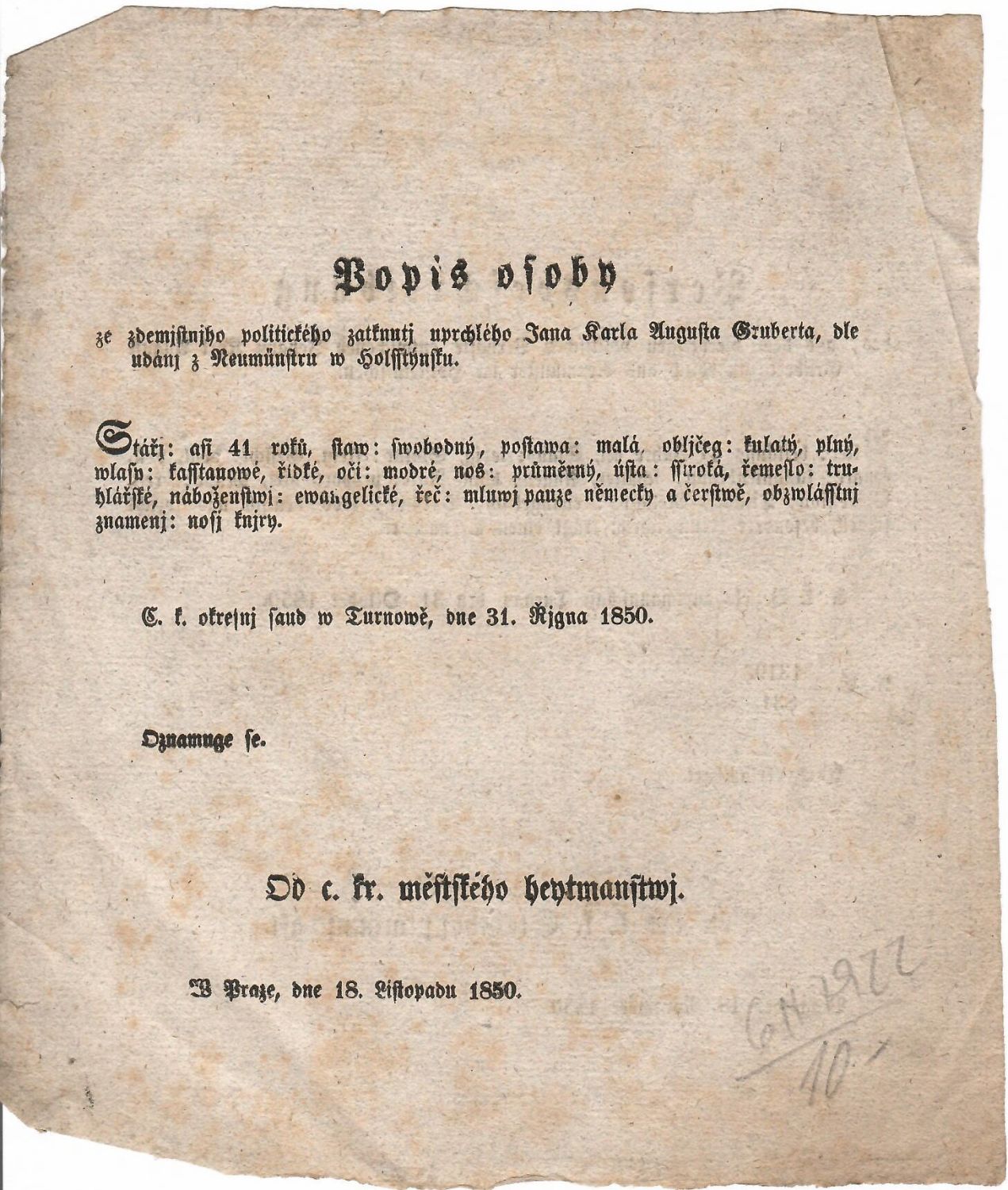 Popis osoby ze zdemjstnjho politického zaknutj uprchlého Jana Karla Augusta Gruberta, dle udánj z Neumünstru w Holsstýnsku.