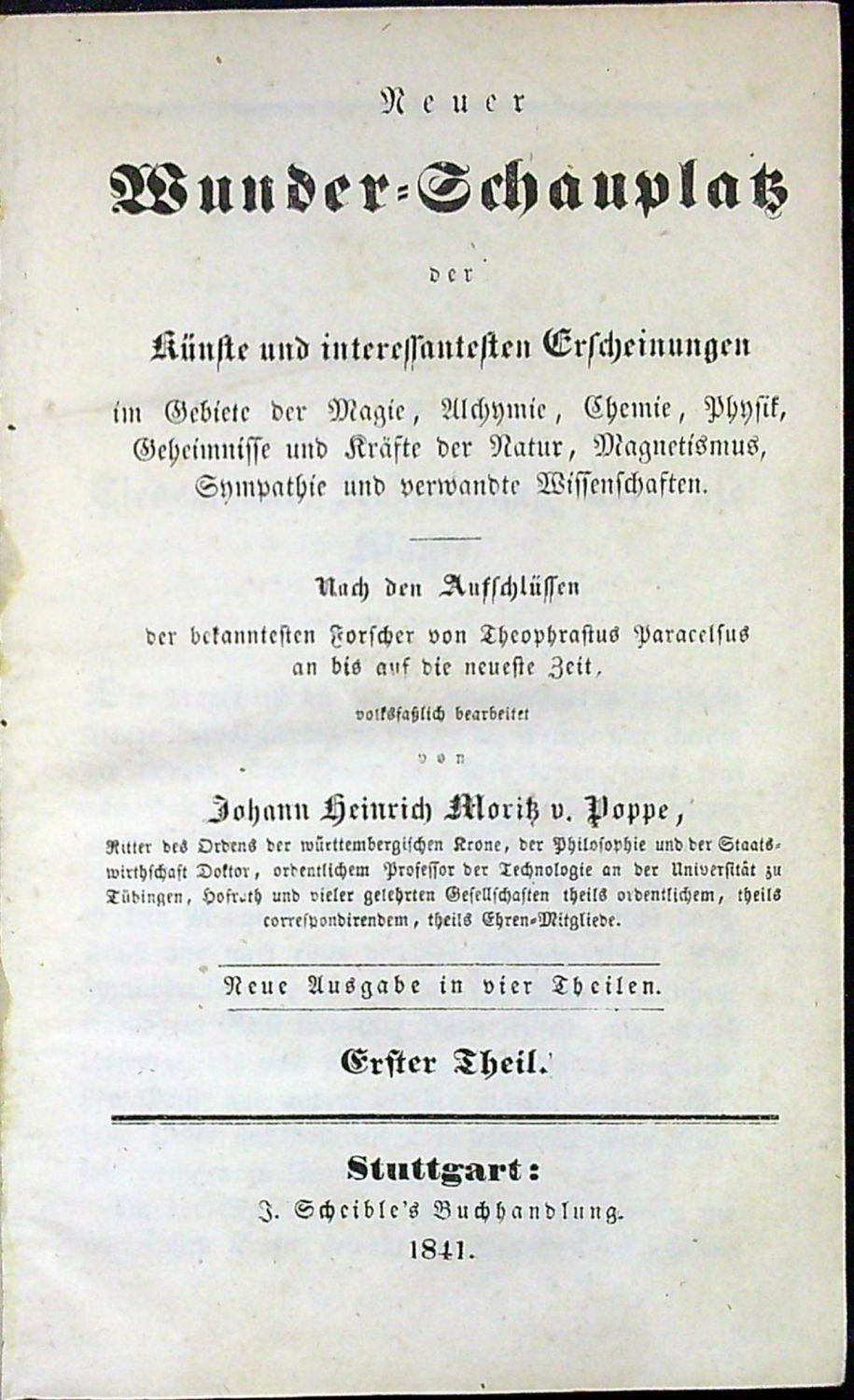 Neuer Wunder=Schauplatz der Künste und interessanten Erscheinungen im Gebiete der Magie, Alchymie, Chemie, Physik, Geheimnisse und Kräfte der Natur, Magnetismus, Sympathie und verwandte Wissenschften. Nach den Aufchlëssen der bekanntesten Forscher von Theophrastus Paracelcus an bis auf die neueste Zeit. Erster + Zweiter Theil (von 4).