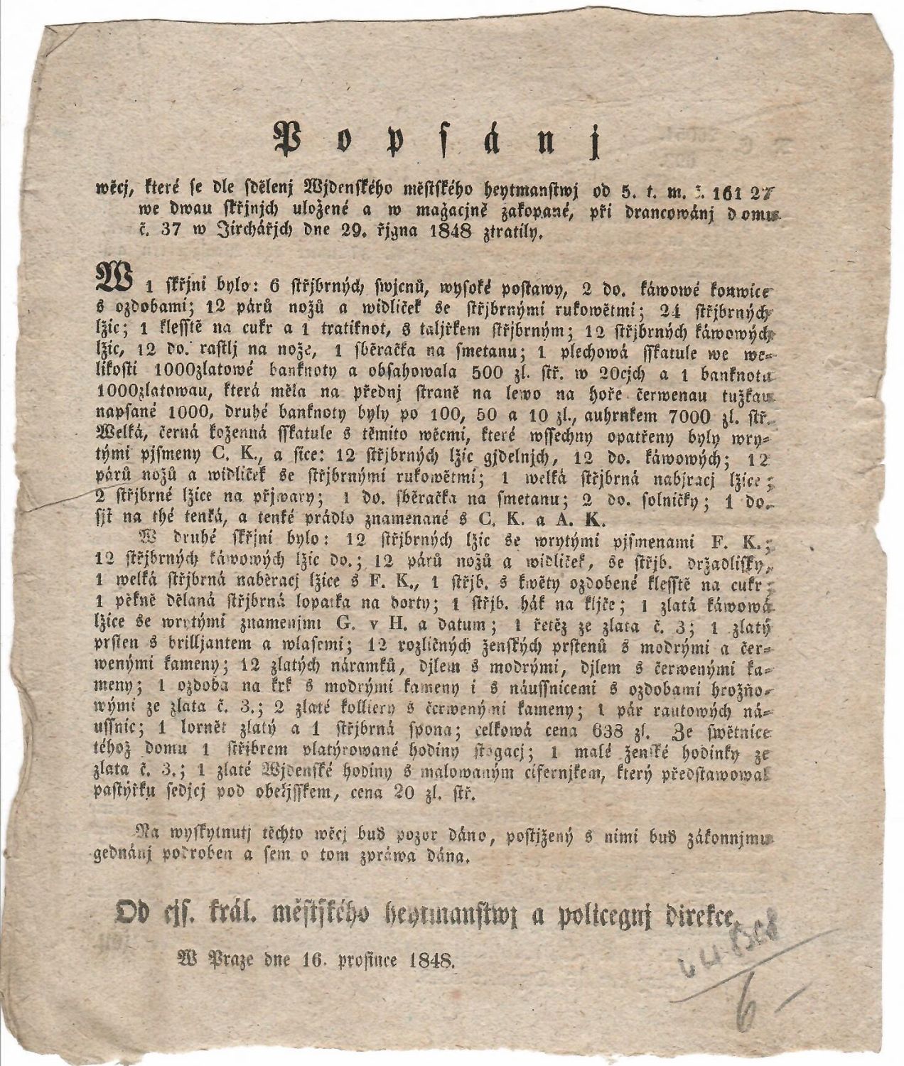 Popsánj wěcj, které se dle sdělenj Wjdenského městského heytmanstwj od 5. t. m. č. 16127 we dwau skřjnjch uložené a w magacjně zakopané, při drancowánj domu č. 37 w Jirchářjch dne 29. řjgna 1848 ztratily.