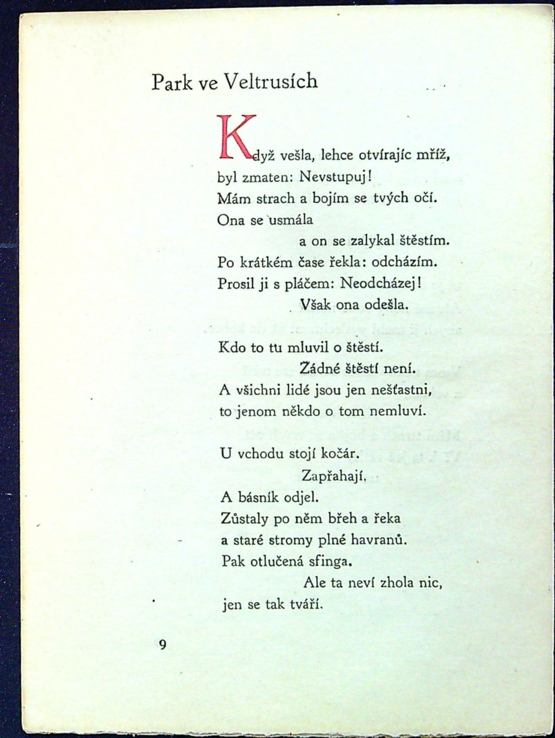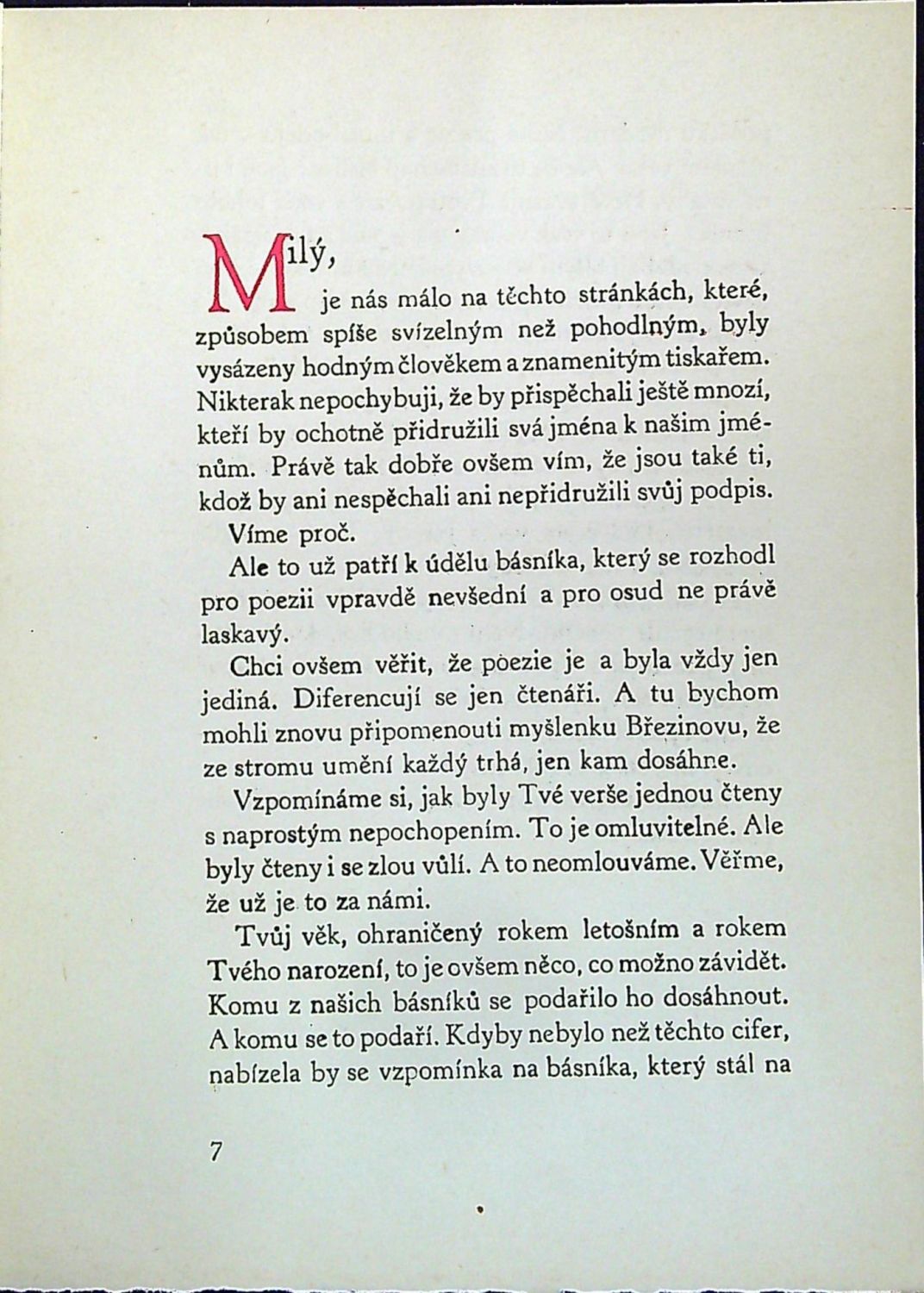 Jeden z 80 exemplářů, které na ručním lisu stránku po stránce vytiskl Alois Chvála, dvoubarevný tisk (červeně tištěný název, tiráž a iniciály. Pozdravení vydali jeho přátele k 80. narozeninám J. Palivce. - Původní pap. obálka s chlopní, ve které je volně vložený složený knižní blok, na přední straně obálky červeně tištěné iniciály básníkovi. Obálka mírně zaprášená, při horním vnějším okraji mírně přehnutá a na straně vnitřní při horním okraji drobná modrá skvrnka od inkoustu. Na předním vakátu nečitelný podpis (Josef Palivec ?).