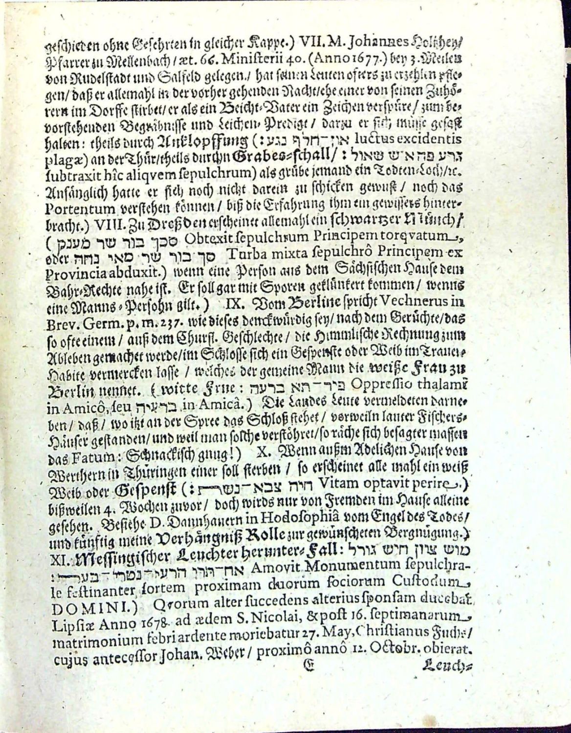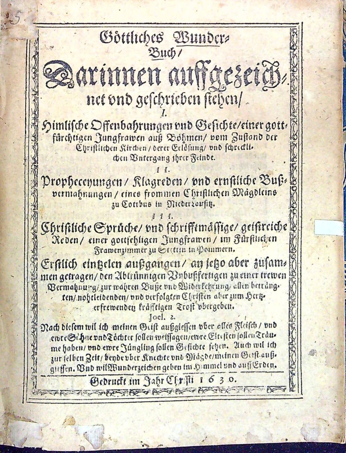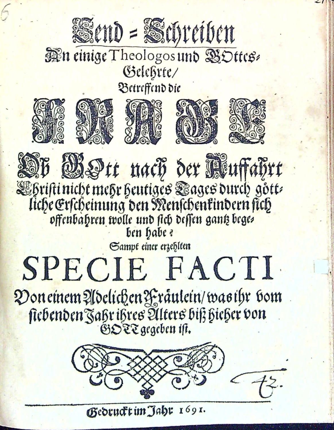 Dünnhaupt 3183,61.<br>Tištěno švabachem, latinský text antikvou, hebrejský hebrejsky, koncová viněta ze sluníček, na tit. listu ozdobná lišta z ornamentů.<br>+ 1. přívazek: Geier, Johann Christoph "I. N. I. Schrifftmässige Engels=Probe Das ist: Unterschiedener vornehmer/ Hochgelahrter reiner Lutherischer Theologen geistreiche und in Gottes Wort gegründete Judicia und Bedencken Was heutiges Tages von Englischen Gesichten und Erscheinungen zu halten? Ob ihnen zu trauen? solche zu begehren/ und zu hören? Bey Gelengenheit des Von Weynachten biss aufs Johannis=Fest In einer Tauben=Gestalt erschienenen Geistes oder vermeynten Engels zu Ober=Grossen im Uhlstädischen Kirch=Spiel Wegen entstandener Irr=und Verwirrung vieler Oerter zu eines iedweden Nachricht gezeiget von ..." Jena, Johann Meyer, 1695. 38 stran, tištěno švabachem, latinský text antikvou, arabská paginace stran uprostřed horního okraje v kulatých závorkách mezi drobnými lístky, vstupní pásový vlys s ilustrací, iniciály propletené úponky zalomené do výše 2-3 řádků, tučně tištěná plná iniciála ve výši 2 řádků zasazená do ilustrace zalomené do výše 6 řádků (KVK eviduje pouze 1 ex. v Universitní a zemské knihovně v Halle).<br>+ 2. přívazek: "Wahre Umständliche Erzehlung von Dem Mägdlein zu Hartmannsdorff obig Penig/ wie solches einige Zeit vor Besessen gehalten/ aber auf sonderbahre Weise falsche erfunden worden/ Gegen die in der so genannten Ausführlichen Beschreibung des Unfugs der Pietisten zu Halberstadt etc. Besindliche/ ....". Jena, Johann Bielcke, 1694. 8 nepagin. listů, tištěno švabachem, latinský text antikvou. Vstupní plná iniciála na ornamentálním pozadí zalomená do výše 5 řádků, v úvodu slovo ke čtenáři od nakladatele J. Bielcka.<br>+ 3. přívazek: "Engelische Erscheinungen/ Öffenbahrungen und Gesichte/ so dreyen Christlichen Personen/ einem Schulmeister in der Pfaltz/ einem Pfarherren im Marggraffthumb Anspach/ und einer Jungfrawen zu Gresslas in Böhmen/ zu unterschiedlichen Zeiten wiederfahren/ vom Zustande dess Römischen Reichs/ .....". Bez místa tisku, nakladatele, 1630. 28 nepagin. listů (poslední čistý). Tištěno švabachem, latinské nadpisy a slova antikvou, na tit. listu lišta z ornamentů, pásové vlysy a lišty z ornamentů, plné iniciály propletené úponky zalomené do výše 2-6 řádků, dvě plné iniciály na pozadí z rostlinného ornamentu zalomené do výše 5-7 řádků. Od folia F-III až do konce popsáno vidění mladé ženy z horského městečka "Gresslas" (Kraslice ?) u Chebu.<br>+ 4. přívazek: "Göttliches Wunder=Buch/ Darinnen auffgezeichnet vnd geschriebewn stehen/ I. Himlische Offenbarungen vnd Gesichte/ einer gottfürchtigen Jungfrawen auss Böhmen/ vom Zustand der Christlichen Kirchen/ derer Erlösung vnd schrecklichen Untergang ihrer Feinde. II. Propheceyungen/ Klagreden/ vnd ernstliche Bussvermahnungen/ eines frommen Christlichen Mägdleins zu Cottbus in NiederLausitz. III. Christliche Sprüche/ vnd schrifftmässige/ geistreiche Reden/ einer gottsehligen Jungfrawen/ im Fürstlichen Frawenzimmer zu Stettin in Pommern. Erstlich eintzelen aussgangen/ an jetzo aber zusammen getragen/ den Abtrünnigen Unbussfertigen zu einer trewen Vermahnung/ zur wahren Busse vnd Widerkehrung/ .... Bez místa tisku, vydavatele, 1630. 92 nepaginovaných listů. Tištěno švabachem, názvy měsíců antikvou. Titulní list v dvojitém rámečku zdobeným ornamentem, ozdobné lišty a tyče z ornamentů, plné iniciály propletené úponky zalomené do výše 3-5 řádků, vstupní vlys z ornamentů, viněty. - V prvním oddílu zaznamenané vidění Kristiny Poniatowské (1610 - 6.12. 1644 Lešno) - dcera polského šlechtice, bratrského duchovního Juliana Poniatowského, který byl také knihovníkem Karla staršího z Žerotína. Po smrti matky žila u baronky Zárubové z Hustiřan na zámku v Horní Branné v Podkrkonoší, kde Komenský připravoval odchod bratří do exilu. V listopadu a prosinci prodělala Kristína několik záchvatů se zrakovými a sluchovými halucinacemi, přivolaný Komenský uvěřil v pravdivost jejích tvrzení. Po příchodu do Lešna ubytoval Komenský Kristinu ve svém domě a písemně zaznamenal 82 jejích vidění, které pak zveřejnil v překladech a několika vydáních. Roku 1632 se Kristina provdala za člena Jednoty bratrské a správce lešenské tiskárny Daniela Strejce a záchvaty a vidění se již neopakovaly. <br>+ 5. přívazek: [Petersen, Johann Wilhelm] "Send=Schreiben An einige Theologos und GOttes=Gelehrte/ Betreffend die FRAGE Ob GOtt nach der Auffahrt Christi nicht mehr heutiges Tages durch göttliche Erscheinung den Menschenkindern sich offenbahren wolle und dessen gantz begeben habe. Sampt einer erzehlten SPECIE FACTI Von einem Adelichen Fräulein/ was ihr vom siebenden Jahr ihres Alters biss hieher von GOTT gegeben ist". Bez místa tisku a vydavatele, 1691. 26 nepaginovaných listů, německý text švabachem, latinská slova antikvou, na tit. listu viněta a slovo Frage v názvu tištěno versálkami na pozadí z ornamentů, vstupní plná iniciála na ornamentálním pozadí zalomená do výše 5 řádků, spisek obsahuje celkem 42 arabsky paginovaných tezí, na posledním listu tiskové opravy. (Exemplář se liší vinětou na tit. listu a typologicky od digitalizovaných exemplářů v KVK).<br> + 6. přívazek: Spenner, Philipp Jacob "Theologisches Bedencken über einige Puncten/ Nahmentlich: 1. Die gerühmte Offenbahrungen eines Adelichen Fräulein. 2. Den D. Petersen Superint. zu Lüneburg/ und das von Ihm behauptete tausend Jährige Reich Christi und 3. Die so genannten Pietischen angehende. Von einem Liebhaber der Wahrheit zum Druck besordet". Bez místa tisku a vydavatele, 1692. Tištěno švabachem, latinská slova antikvou, 8 nepaginovaných listů, vstupní pásový vlys z ornamentů.<br> + 7. přívazek: Winckler, Johann "Sch