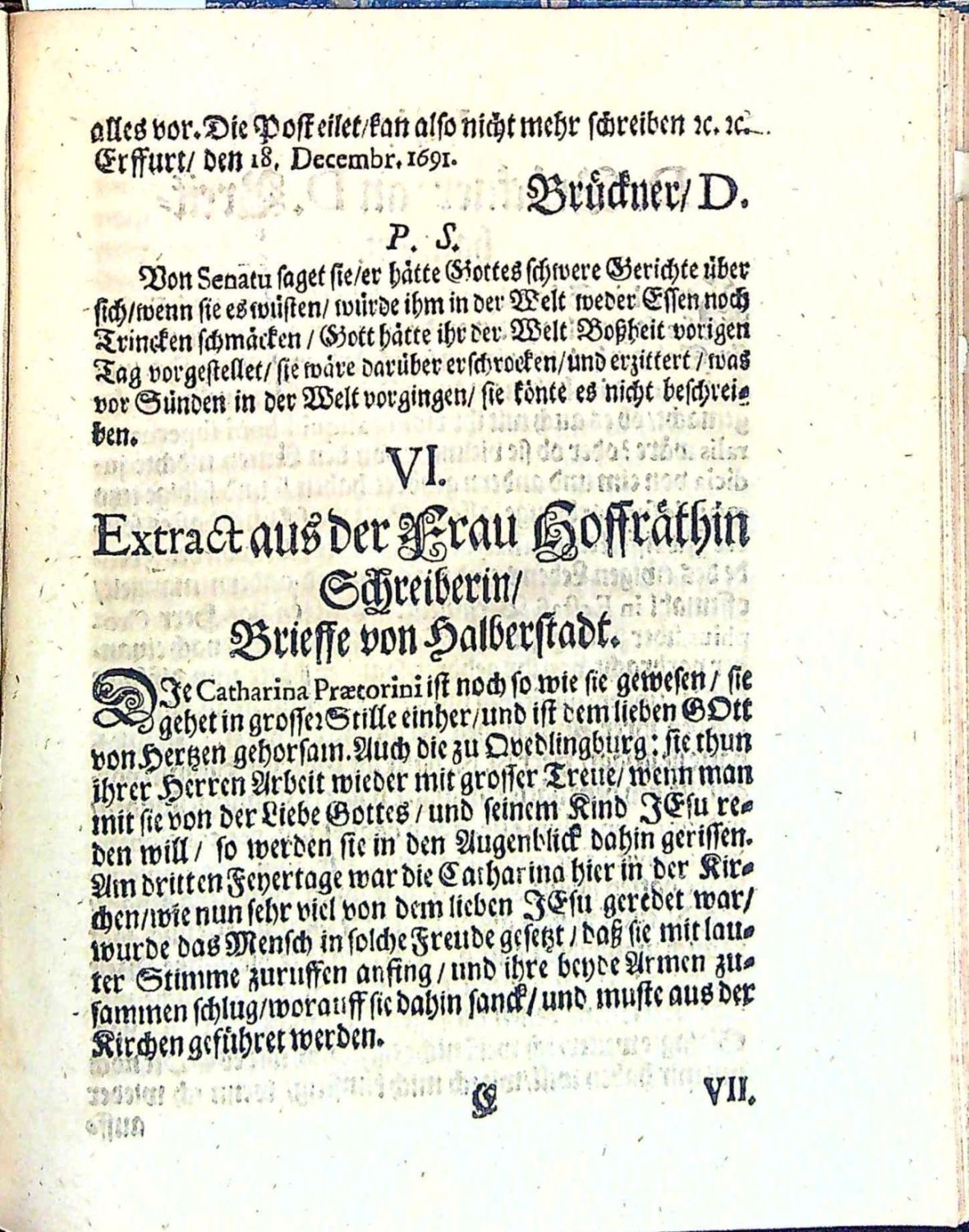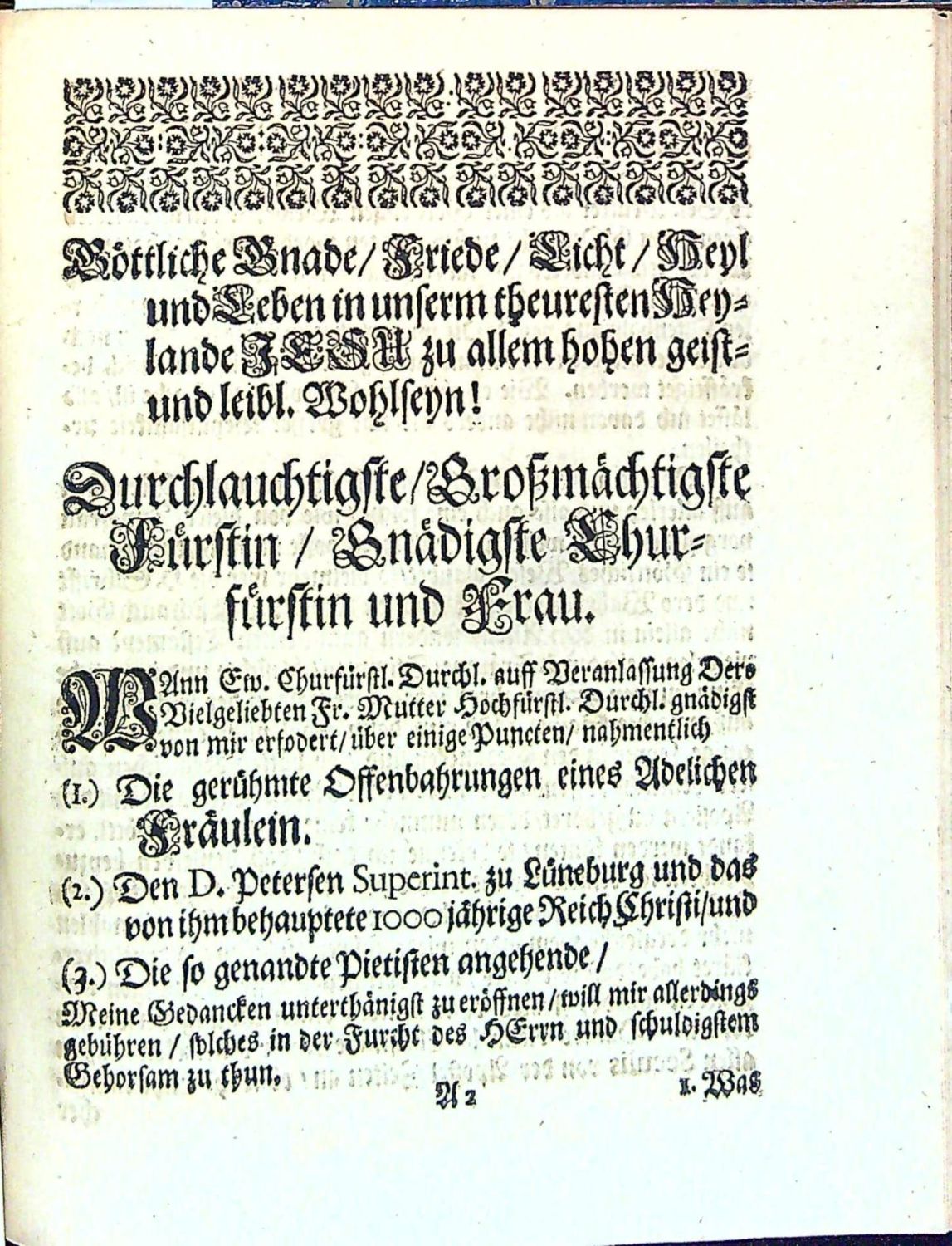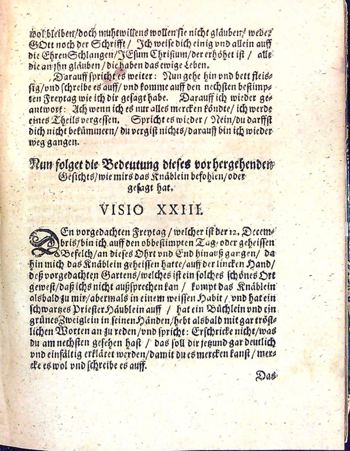 Dünnhaupt 3183,61.<br>Tištěno švabachem, latinský text antikvou, hebrejský hebrejsky, koncová viněta ze sluníček, na tit. listu ozdobná lišta z ornamentů.<br>+ 1. přívazek: Geier, Johann Christoph "I. N. I. Schrifftmässige Engels=Probe Das ist: Unterschiedener vornehmer/ Hochgelahrter reiner Lutherischer Theologen geistreiche und in Gottes Wort gegründete Judicia und Bedencken Was heutiges Tages von Englischen Gesichten und Erscheinungen zu halten? Ob ihnen zu trauen? solche zu begehren/ und zu hören? Bey Gelengenheit des Von Weynachten biss aufs Johannis=Fest In einer Tauben=Gestalt erschienenen Geistes oder vermeynten Engels zu Ober=Grossen im Uhlstädischen Kirch=Spiel Wegen entstandener Irr=und Verwirrung vieler Oerter zu eines iedweden Nachricht gezeiget von ..." Jena, Johann Meyer, 1695. 38 stran, tištěno švabachem, latinský text antikvou, arabská paginace stran uprostřed horního okraje v kulatých závorkách mezi drobnými lístky, vstupní pásový vlys s ilustrací, iniciály propletené úponky zalomené do výše 2-3 řádků, tučně tištěná plná iniciála ve výši 2 řádků zasazená do ilustrace zalomené do výše 6 řádků (KVK eviduje pouze 1 ex. v Universitní a zemské knihovně v Halle).<br>+ 2. přívazek: "Wahre Umständliche Erzehlung von Dem Mägdlein zu Hartmannsdorff obig Penig/ wie solches einige Zeit vor Besessen gehalten/ aber auf sonderbahre Weise falsche erfunden worden/ Gegen die in der so genannten Ausführlichen Beschreibung des Unfugs der Pietisten zu Halberstadt etc. Besindliche/ ....". Jena, Johann Bielcke, 1694. 8 nepagin. listů, tištěno švabachem, latinský text antikvou. Vstupní plná iniciála na ornamentálním pozadí zalomená do výše 5 řádků, v úvodu slovo ke čtenáři od nakladatele J. Bielcka.<br>+ 3. přívazek: "Engelische Erscheinungen/ Öffenbahrungen und Gesichte/ so dreyen Christlichen Personen/ einem Schulmeister in der Pfaltz/ einem Pfarherren im Marggraffthumb Anspach/ und einer Jungfrawen zu Gresslas in Böhmen/ zu unterschiedlichen Zeiten wiederfahren/ vom Zustande dess Römischen Reichs/ .....". Bez místa tisku, nakladatele, 1630. 28 nepagin. listů (poslední čistý). Tištěno švabachem, latinské nadpisy a slova antikvou, na tit. listu lišta z ornamentů, pásové vlysy a lišty z ornamentů, plné iniciály propletené úponky zalomené do výše 2-6 řádků, dvě plné iniciály na pozadí z rostlinného ornamentu zalomené do výše 5-7 řádků. Od folia F-III až do konce popsáno vidění mladé ženy z horského městečka "Gresslas" (Kraslice ?) u Chebu.<br>+ 4. přívazek: "Göttliches Wunder=Buch/ Darinnen auffgezeichnet vnd geschriebewn stehen/ I. Himlische Offenbarungen vnd Gesichte/ einer gottfürchtigen Jungfrawen auss Böhmen/ vom Zustand der Christlichen Kirchen/ derer Erlösung vnd schrecklichen Untergang ihrer Feinde. II. Propheceyungen/ Klagreden/ vnd ernstliche Bussvermahnungen/ eines frommen Christlichen Mägdleins zu Cottbus in NiederLausitz. III. Christliche Sprüche/ vnd schrifftmässige/ geistreiche Reden/ einer gottsehligen Jungfrawen/ im Fürstlichen Frawenzimmer zu Stettin in Pommern. Erstlich eintzelen aussgangen/ an jetzo aber zusammen getragen/ den Abtrünnigen Unbussfertigen zu einer trewen Vermahnung/ zur wahren Busse vnd Widerkehrung/ .... Bez místa tisku, vydavatele, 1630. 92 nepaginovaných listů. Tištěno švabachem, názvy měsíců antikvou. Titulní list v dvojitém rámečku zdobeným ornamentem, ozdobné lišty a tyče z ornamentů, plné iniciály propletené úponky zalomené do výše 3-5 řádků, vstupní vlys z ornamentů, viněty. - V prvním oddílu zaznamenané vidění Kristiny Poniatowské (1610 - 6.12. 1644 Lešno) - dcera polského šlechtice, bratrského duchovního Juliana Poniatowského, který byl také knihovníkem Karla staršího z Žerotína. Po smrti matky žila u baronky Zárubové z Hustiřan na zámku v Horní Branné v Podkrkonoší, kde Komenský připravoval odchod bratří do exilu. V listopadu a prosinci prodělala Kristína několik záchvatů se zrakovými a sluchovými halucinacemi, přivolaný Komenský uvěřil v pravdivost jejích tvrzení. Po příchodu do Lešna ubytoval Komenský Kristinu ve svém domě a písemně zaznamenal 82 jejích vidění, které pak zveřejnil v překladech a několika vydáních. Roku 1632 se Kristina provdala za člena Jednoty bratrské a správce lešenské tiskárny Daniela Strejce a záchvaty a vidění se již neopakovaly. <br>+ 5. přívazek: [Petersen, Johann Wilhelm] "Send=Schreiben An einige Theologos und GOttes=Gelehrte/ Betreffend die FRAGE Ob GOtt nach der Auffahrt Christi nicht mehr heutiges Tages durch göttliche Erscheinung den Menschenkindern sich offenbahren wolle und dessen gantz begeben habe. Sampt einer erzehlten SPECIE FACTI Von einem Adelichen Fräulein/ was ihr vom siebenden Jahr ihres Alters biss hieher von GOTT gegeben ist". Bez místa tisku a vydavatele, 1691. 26 nepaginovaných listů, německý text švabachem, latinská slova antikvou, na tit. listu viněta a slovo Frage v názvu tištěno versálkami na pozadí z ornamentů, vstupní plná iniciála na ornamentálním pozadí zalomená do výše 5 řádků, spisek obsahuje celkem 42 arabsky paginovaných tezí, na posledním listu tiskové opravy. (Exemplář se liší vinětou na tit. listu a typologicky od digitalizovaných exemplářů v KVK).<br> + 6. přívazek: Spenner, Philipp Jacob "Theologisches Bedencken über einige Puncten/ Nahmentlich: 1. Die gerühmte Offenbahrungen eines Adelichen Fräulein. 2. Den D. Petersen Superint. zu Lüneburg/ und das von Ihm behauptete tausend Jährige Reich Christi und 3. Die so genannten Pietischen angehende. Von einem Liebhaber der Wahrheit zum Druck besordet". Bez místa tisku a vydavatele, 1692. Tištěno švabachem, latinská slova antikvou, 8 nepaginovaných listů, vstupní pásový vlys z ornamentů.<br> + 7. přívazek: Winckler, Johann "Sch