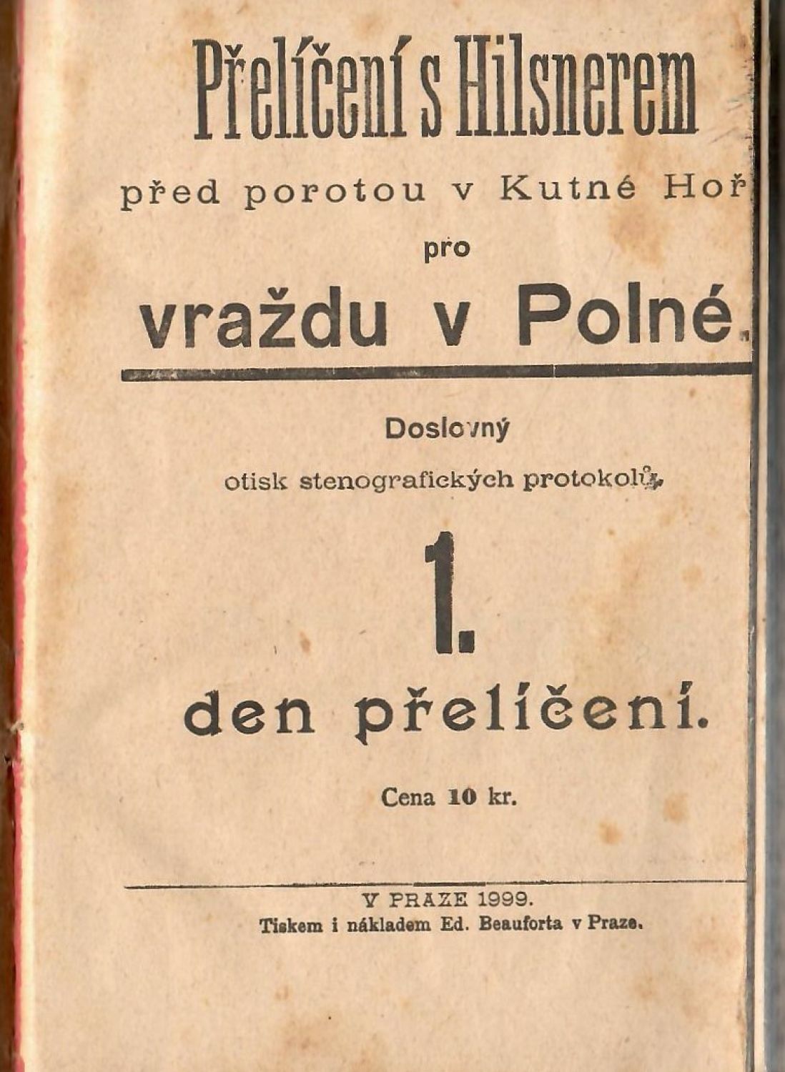 Přelíčení s Hilsnerem před porotou v Kutné Hoře pro vraždu v Polné. Doslovný otisk stenografických protokolů. 1. den přelíčení. (Pouze 1. a 2. den přelíčení z 5)