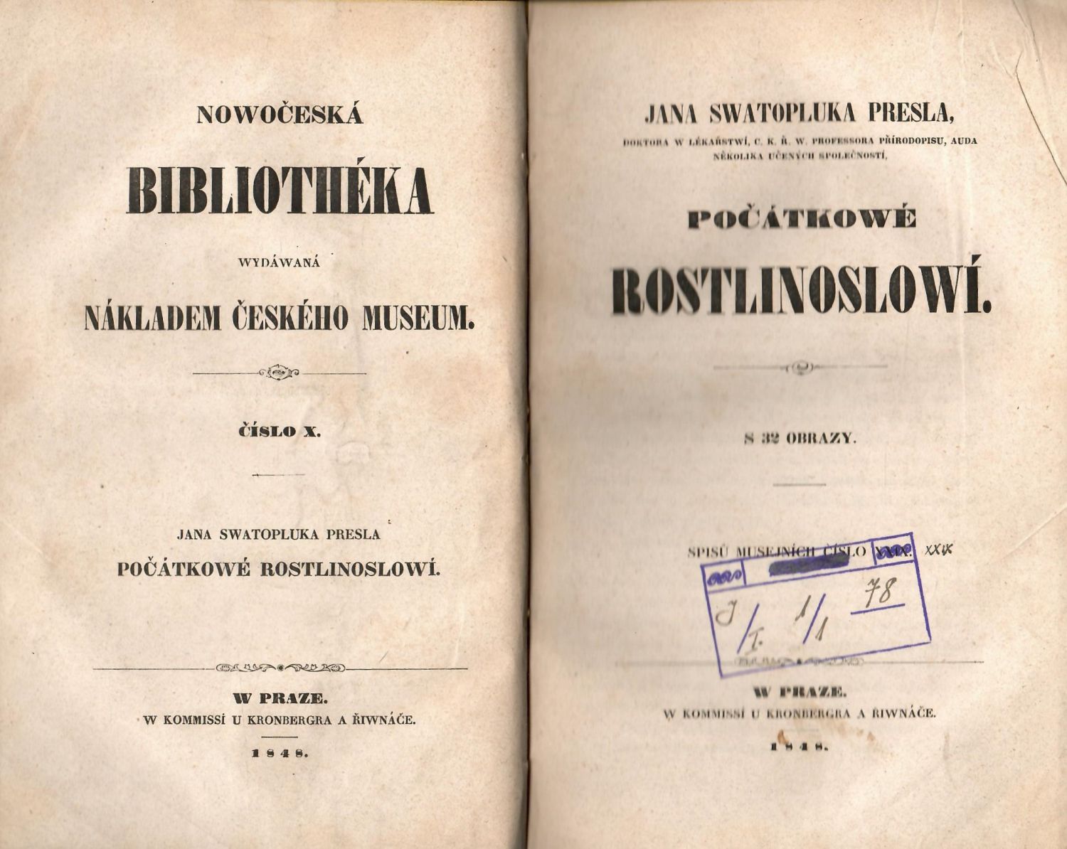 Nowočeská bibliothéka, č. X., Spisů musejních číslo XXIX. - Textový svazek s deskami potaženými mramorovaným papírem, plátěným hřbetem a nárožnicemi, ve hřbetu zlacené linky a název. Na tit. listu staré knih. razítko s číslem (bez uvedení knihovny); obrazový svazek v celoplátěné vazbě (desky potažené černým plátnem, hřbet a nárožnice světle hnědým), ve spodní polovině hřbetu plátěný pokryv chybí, naražené rohy, místy světle hnědé mapky.<br>Jan Svatopluk Presl (4.9.1791 v Praze - 6.4.1849 v Praze), významný přírodovědec a národní buditel, zakladatel přírodovědné literatury české, profesor mineralogie a zoologie na pražské universitě, od roku 1848 člen vídeňské Akademie. Položil základy českého názvosloví botanického.