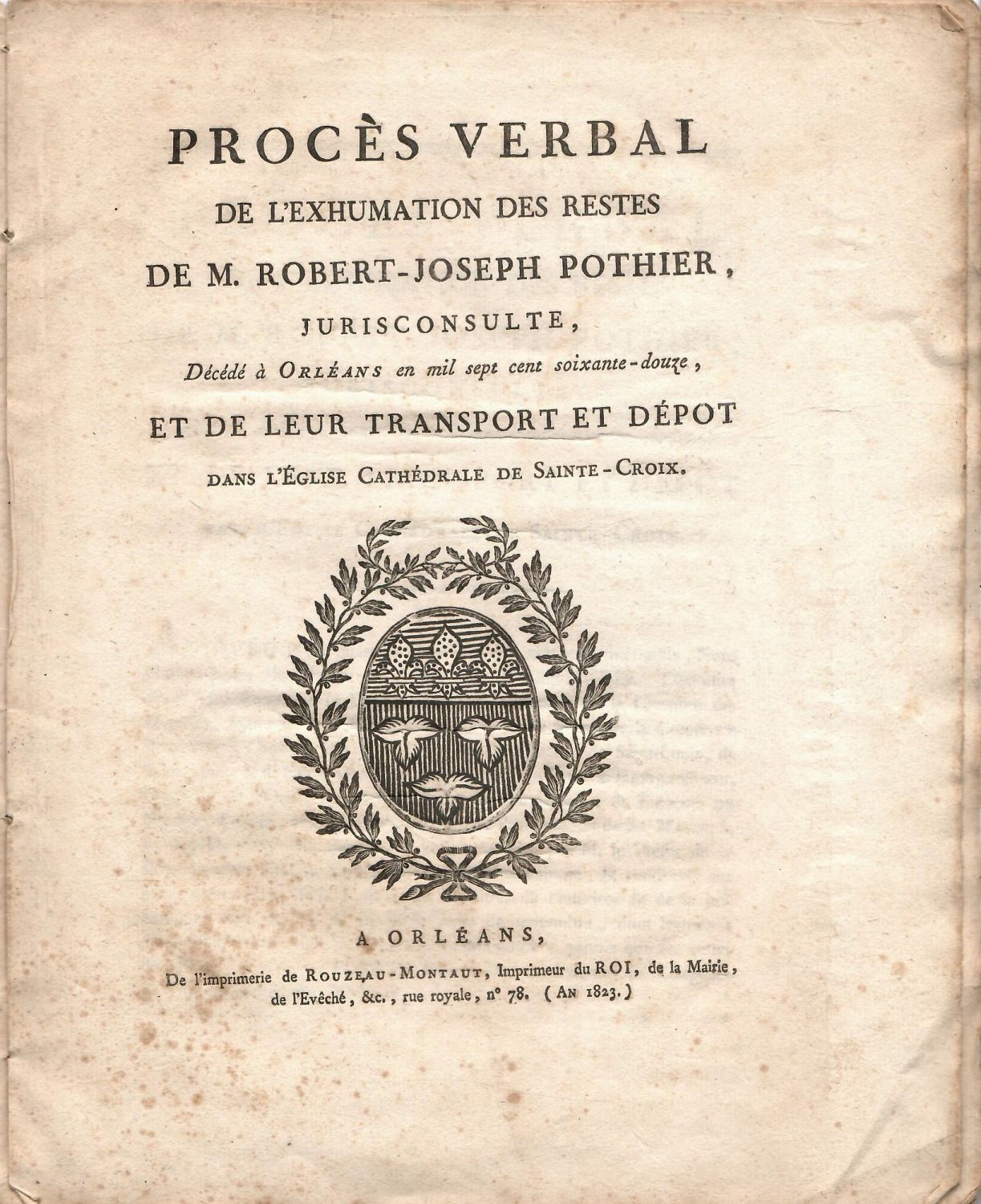 Na tit. listu dřevoryt erbu zasazeného mezi dvě vavřínové ratolesti. Papír místy zahnědlý, strana 3-4 při spodním vnějším okraji natržená, u str. 7-8 při spodním vnějším okraji utržen kus papíru (bez zásahu do textu). - Dobová pap. obálka zašpiněná, při vnějším okraji a ve hřbetu potrhaná. - Protokol o exhumaci ostatků a jejich přenesení do místní katedrály právníka Pothiera, který zemřel v Orléansu roku 1772.<br>Robert Joseph Pothier (9.1. 1699 Orléans - 2.3. 1772 Orléans), od roku 1720 až do své smrti soudcem v Orléansu, od roku 1749 profesorem práv na místní universitě. Autor řady monografií o francouzském právu, řada jehotextů byla zařazena do francouzského občanského zákoníku. Jeho teorie smluvního práva se uplatnila i v Anglii a v USA.