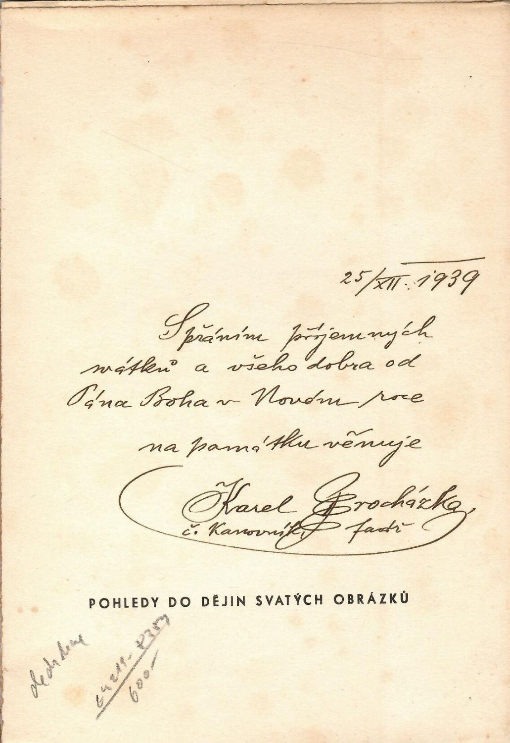 Na patitulu rukopisná dedikace K. Procházky. Listy zažloutlé, některé uvolněné z vazby. Desky ošoupané, přední deska při spodním okraji hřbetu lehce natržena.