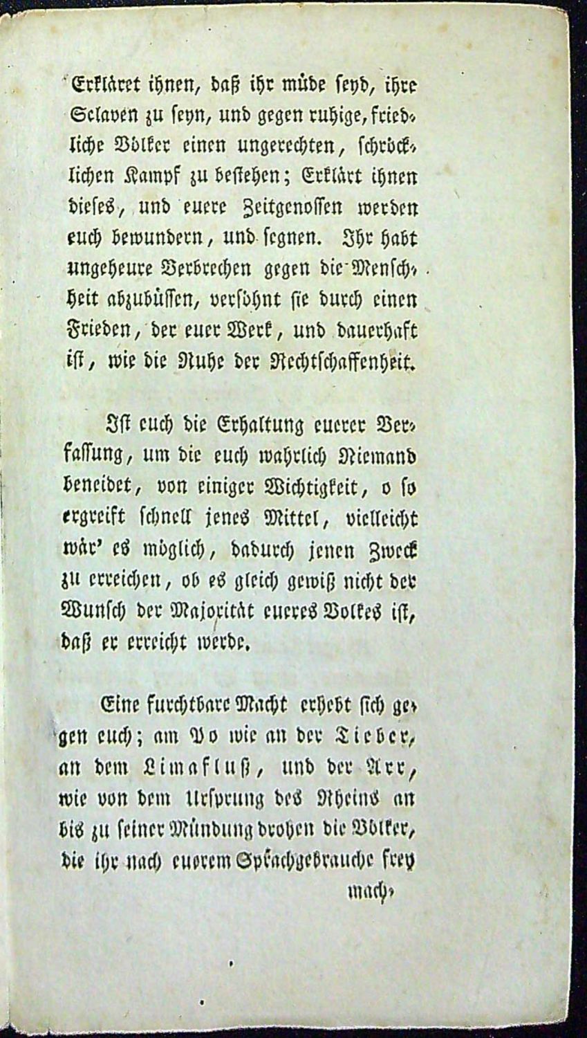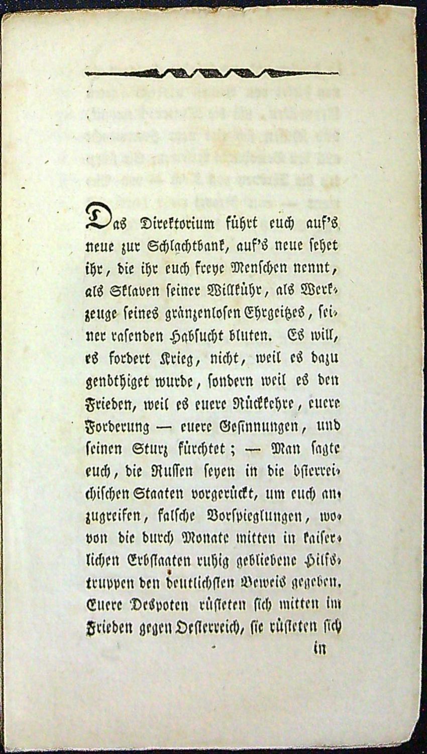 BCBT; SKC; KVK neevidují. <br>Tištěno švabachem, vstupní plná iniciála, prolamovaná ozdobná tyč v záhlaví prvé strany a koncová mizící tyč. - Anonymní apel na francouzské vojáky, aby donutili své vládní despoty k míru a tím zachránili svoji vlast.