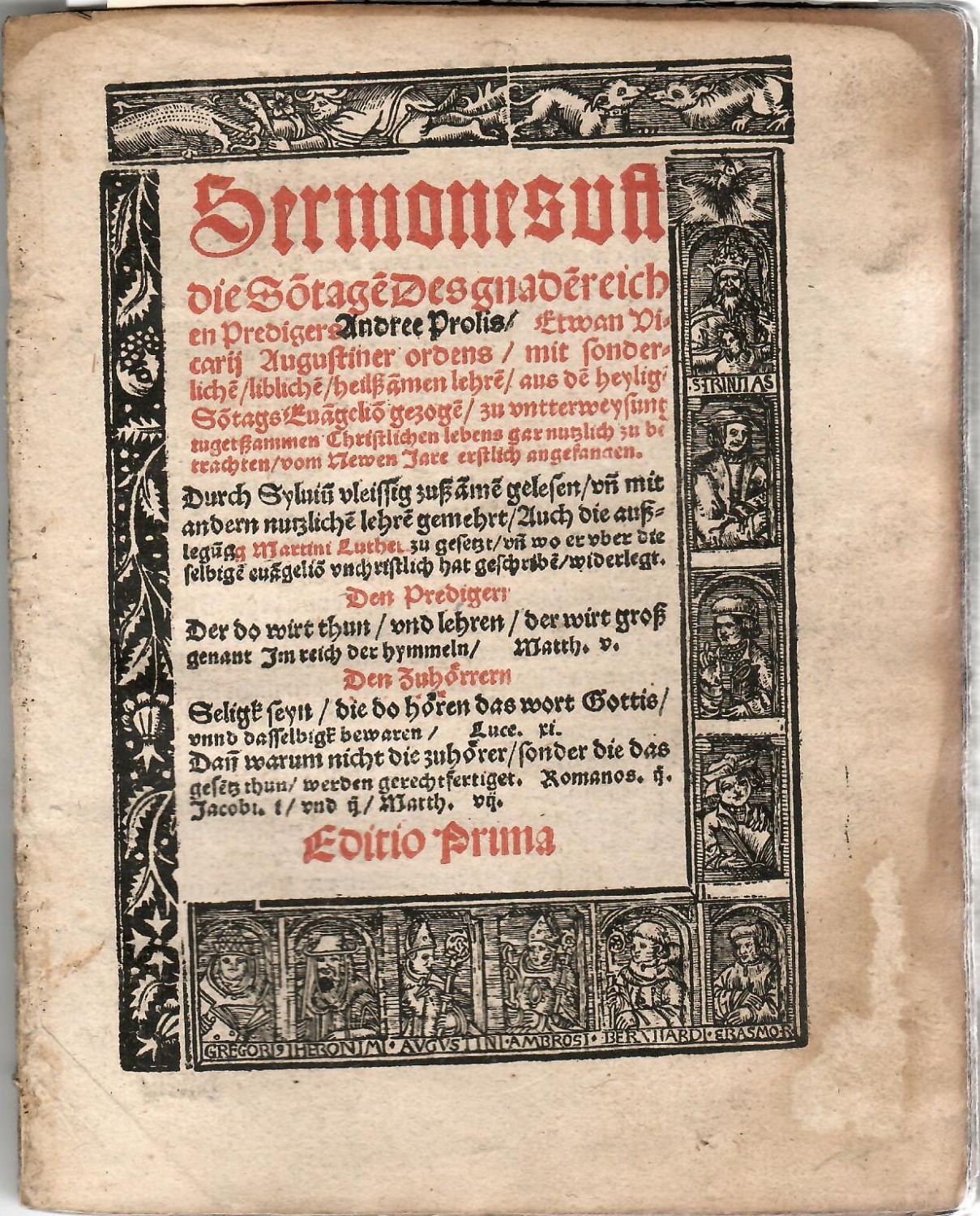 Původní brožura bez vazby, kdysi zřejmě součást většího konvolutu. Na titulním listu tištěném dvojbarevně (černě a červeně)dřevořezový rám složený ze tří lišt. Jedna z lišt je vyzdobena rostlinným dekorem, druhá je obsahu alegorického a na třetí jsou portréty církevních otců (Řehoře, Augustina, Ambrože....), ale také portrét Erasma Rotterdamského a dalších anonymních humanistů. Na druhém listu dvě dřevořezové viněty, na listu posledním závěrečný dřevořez, alegorie církve vítězné. v textu řada rkp. poznámek a glos ze 16. století. Na mnoha místech textu hnědé skvrny a skvrnky způsobené vlhkostí, přesto ve stavu slušném.<br>Kl.-4°, 50 Bl. Broschüre (aus einem Sammelband ausgebunden).<br>Rot-schwarz gedruckter Titel in Holzschnitt-Einfassung, mit Abbildungen einiger Kirchenväter und bedeutender Männer, die Entscheinend zur Lehre und zum Selbstverständnis des Christentums beigetragen haben (Gregor, Hieronymus, Augustinus, Ambrosius, Bernardus) und Erasmus Rotterdamus u.a. Anfangs- und Schlussvignette. Mit einigen handgeschr. Notizen. Stark wasserfleckig und gebräunt.<br>Vier Sonntagspredigten, die der berühmte Augustiner-Generalvikar Andreas Proles (1429 - 1503) vom Fest der Erscheinung Christi an, bis auf den dritten Sonntag hernach gehalten hat. Erster Teil von vier Lieferungen (Leipzig 1530 - 1533), die der sächsische Theologe, Prediger und katolischer Schriftsteller der Reformationszeit und Luthers Gegner Petrus Sylvius (1470 - 1547) herausgegeben hat. Sylvius hat das Buch mit einer Vorrede und vielen Anmerkungen versehen, Luthers Auslegung und seine Widerlegung beigefügt. Er verfasste auch etwa 30 polemische Schriften gegen Luther.<br>VD 16 P,5005; Graesse V, 457.