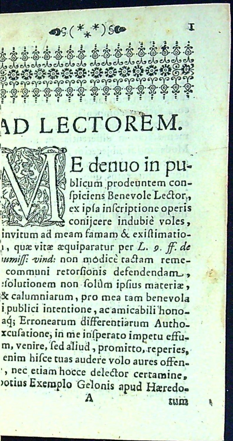 Knihopis K14444<br>Živá záhlaví, tučně tištěné versálky ve výši 2 řádků, vstupní konturová iniciála na rostlinném pozadí zalomená do výše 5 řádků, vstupní pásová lišta z rostlinného ornamentu, drobná vinětka na kjonci rejstříku.<br>Vazba z první poloviny 20. století, desky potažené imitací kůže, kožený hřbet se 4 vazy, ve druhém poli tlačený a zlacený název, červeně barvené ořízky. Na zadním přídeští vlastnické razítko "MUDr. František Bezecný". <br>Pražský rodák Jan Jindřich Proškovský z Krohensteinu (1622-1668) se r. 1652 se stal sekretářem apelačního soudu, 1657 dosáhl hodnosti doktorské a téhož roku se stal apelačním radou. Vedl veřejný učený spor a literární polemiku s profesorem pražské university a slavným právníkem Kryštofem Kyblínem z Waffenburgu. "Diokisis" je reakcí na spis "De differentii juris communis et patrii" z r. 1663, v němž Kyblín srovnává domácí české právo s právem římským a církevním. Proškovský ve svém díle ukazuje některá Kyblínova nedopatření a pochybení. Nešetrná Kyblínova odpověď přiměla Proškovského k napsání nabízené. Tímto sporem byl u mladších právníků vzbuzen větší zájem o právo domácí.