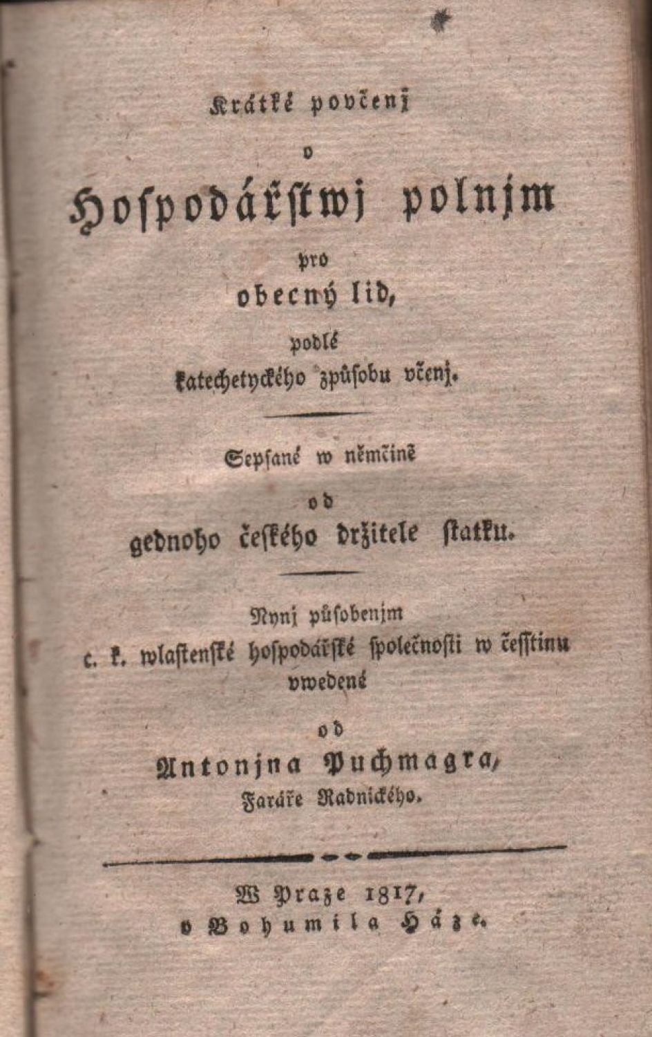 Krátké poučenj o hospodářstwj polnjm pro obecný lid, podlé katechetyckého způsobu učenj. Sepsané v němčině od gednoho českého držitele statku. Nynj působenjm c. k. wlastenecké hospodářské společnosti w česstinu uwedené od Antonjna Puchmagra, Faráře Radnického.