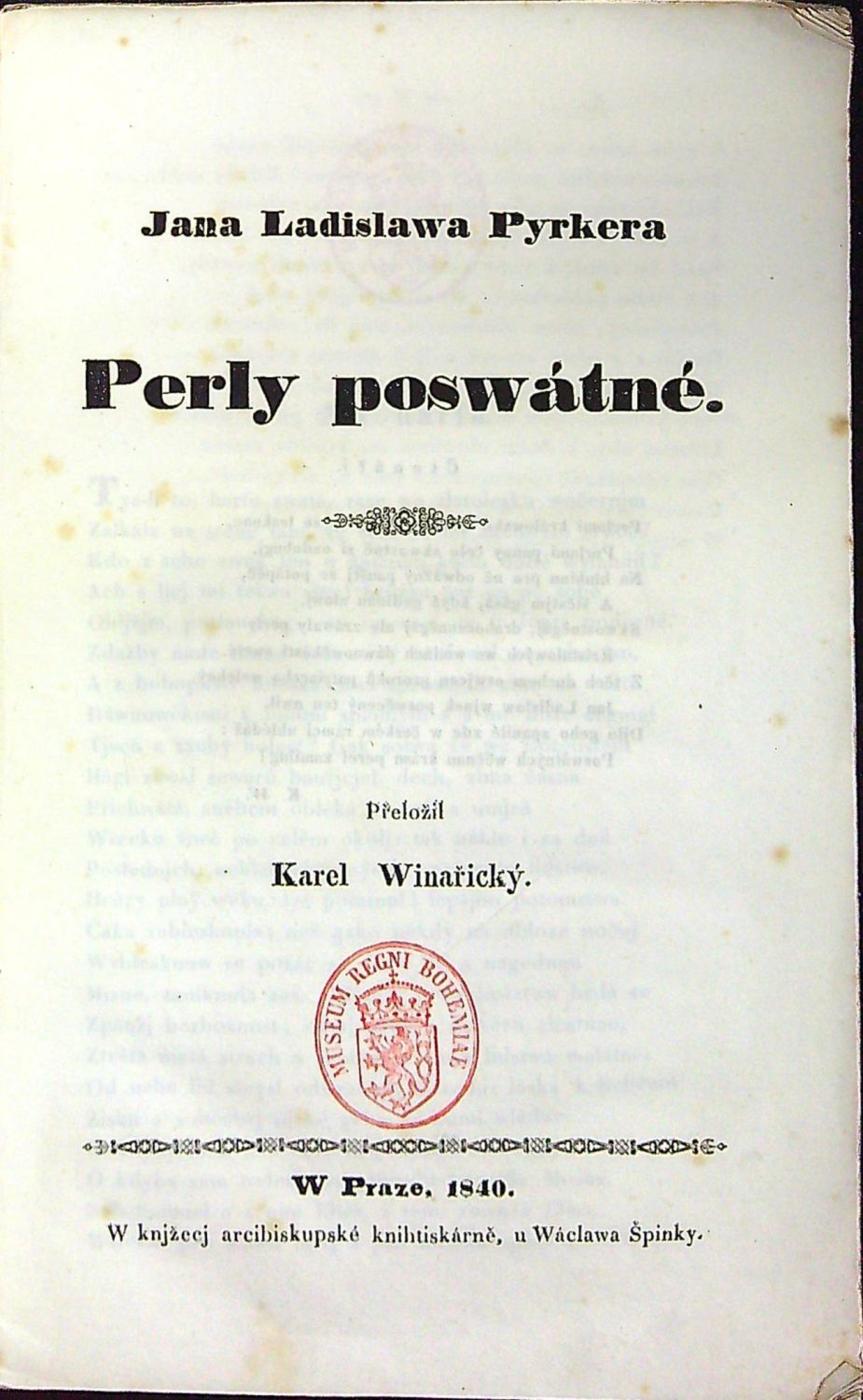 Tištěno antikvou, přeložil Karel Vinařický. - Pův. pap. obálka, ve hřbetu místy potrhaný papír, oslí uši. Na přední straně obálky, na tit. listu a na konci stará razítka z konce 19. století "Museum Regni Bohemiae".