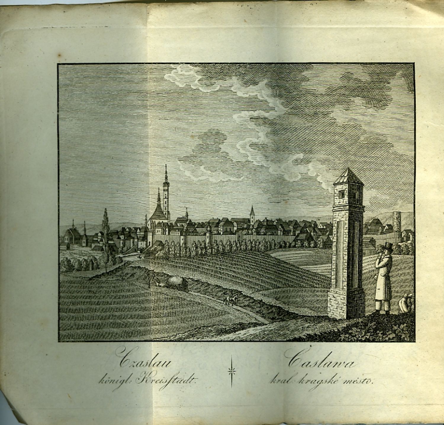 Německý text a názvy obcí v českém jazyce tištěny gotikou, ve front. rozkládací mědirytina s pohledem na město Čáslav. - Původní papírová obálka ve hřbetu prasklá, při spodním okraji přes hřbet přelepen pap. knihovnický štítek, oslí uši.<br>Celkem vyšlo 12 sešitů různých českých krajů, dílo vycházelo jako příloha časopisu Hyllos, který redigoval K. E. Rainold.