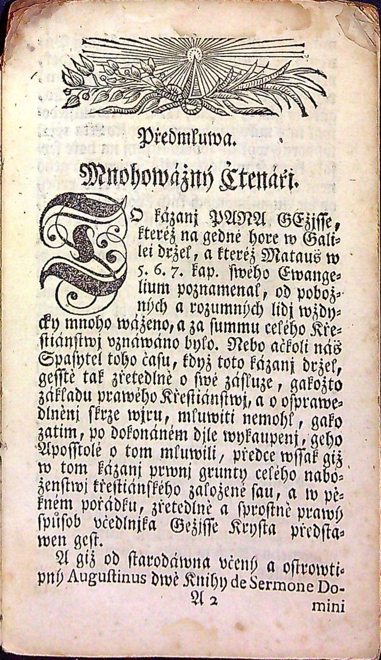 Přemysslowánj s Wýkladem a Naučenjm O Osmerým Blahoslawenstwj, Kterým Pán Gežjš swé kázánj na hoře začal, w kterých se Každé slowo swětle wygadruge, sama wěc předstawuge a wykládá, y giné prawdy odtud wywodj, Wssecko pak k wzdělánj wynakládá.