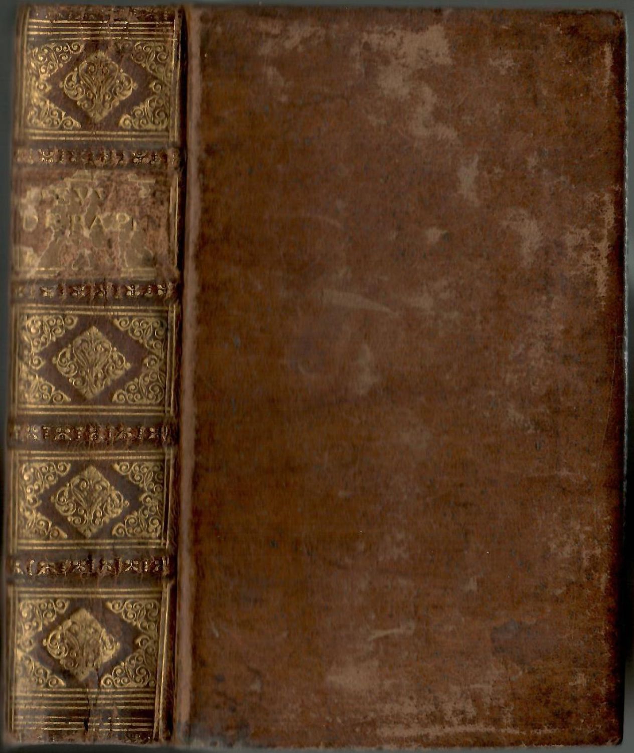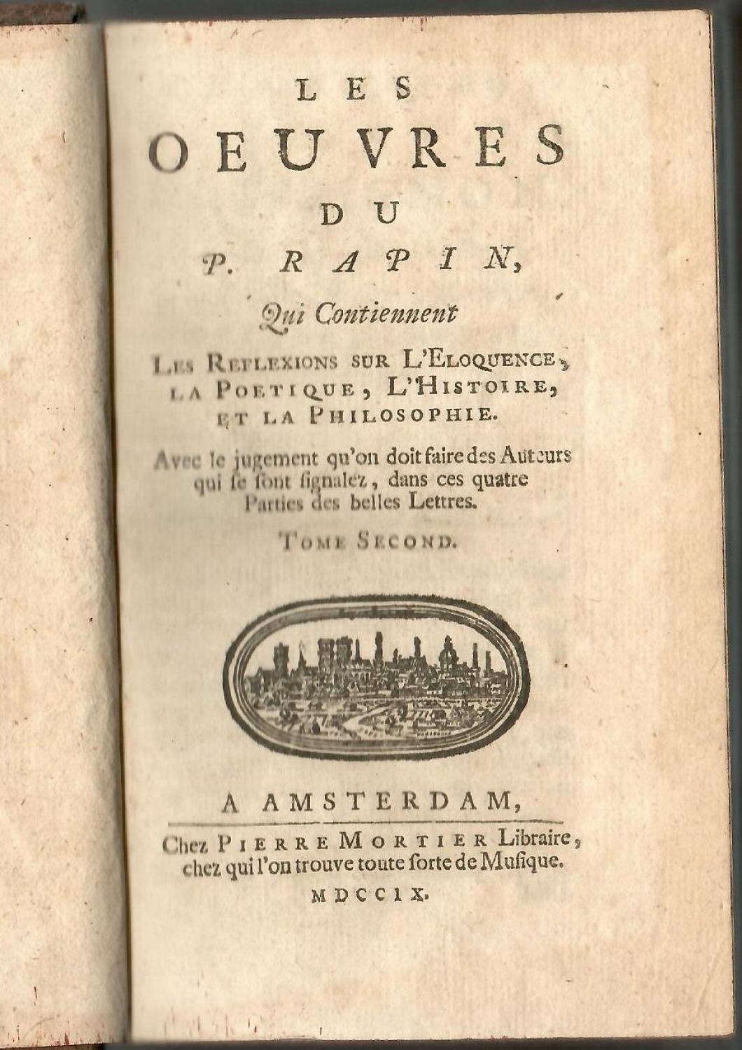 Na titulních listech dřevořezové viněty v oválném medailonu, konturové iniciály na rostlinném pozadí ve výši 4-6 řádků, viněty, živá záhlaví, tištěné poznámky po stranách, tučně tištěné versálky ve výši 2 řádků. Každý díl se samostatným tit. listem, první ... "Les Comparaisons des Grands HOMMES de L´ANTIQUITE, Qui ont les plus excellé dans les belles Lettres. Voyez la Page suivante", druhý ..."Les Reflexions sur L´Eloquence, La Poetique, L´Historie, et la Philosophie. Avec le jugement qu´on doit faire des Auteurs qui se sont signalez, dans ces quatre Parties des belles Lettres". Ve druhém svazku prvních 22 stran nepaginováno. <br>Dobová vazba z hnědé hlazené hověziny, ve hřbetu 4 vazy, ve druhém poli tlačený a zlacený název, v ostatních polích ve dvojitém jednoduchém rámečku tlačený a zlacený ornament rostlinného charakteru stříkané ořízky. Vazba ohmataná a místy lehce odřená, zlacení titulu ve hřbetu zčásti setřené.<br>René Rapin (1621 Tours - 1687 Paříž), francouzský jezuita, spisovatel a profesor rétoriky na různých jezuitských kolejích. Poesii psal v latinském jazyce a ve své době byl pokládán za předního mistra latinského verše. Francouzsky publikoval řadu kritických esejů a též několik teologických a asketických pojednání. Jeho nejznámějším dílem je posmrtně publikovaná "Historie Jansenismu", o které Saint Beave napsal, že je plná omylů. Pozdější studie různých autorů však prokázaly, že dílo je věrohodné, a že je stále platným pramenem pro historii Jansenismu. Sebrané spisy Rapinovy vyšly poprvé v Amsterdamu v letech 1709-1710 ve třech svazcích.