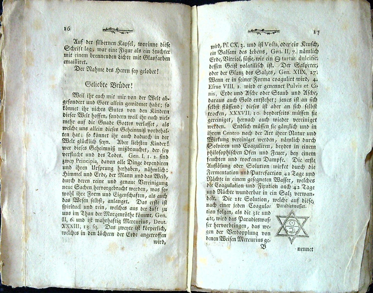 Ferchl, s. 542; Fergusson II, s. 471; Kopp I, s. 227<br>Tištěno frakturou, latinská slova antikvou, prvé dva listy nepaginovány. Na str. 11-16 otištěn údajný rukopis, nalezený v ruinách starého kostela poblíž Lüneburgu, na str. 19-32 traktát "Tinctura Medicinalis et Metallurgica", datovaný "in Schweinitz den 26. Octobr. 1692 in Oberungarn. Dein treuer ... Vater Johann Jacob Neuhauß, Medicin Doct.", na str. 33-44 pojednání "Eine Tinctur, aus der Metallen Schwefel und Salze zu machen", končící textem: "Geschrieben in meiner Hütte und kleinen Zelle, Anno 1782. Der Herausgeber, Iamimah koranhapuCH". - Dobová nezdobená obálka z modrošedého papíru, při horním okraji hřbetu černým inkoustem věcný název a datace tisku, níže stopa po štítku; obálka zašpiněná, konce hřbetu mírně nantržená, oslí uši, průběžně hnědé skvrny. Na tit. listu nečitelný vlastnický přípis z konce 18. století a razítko námi neurčené lóže.<br>