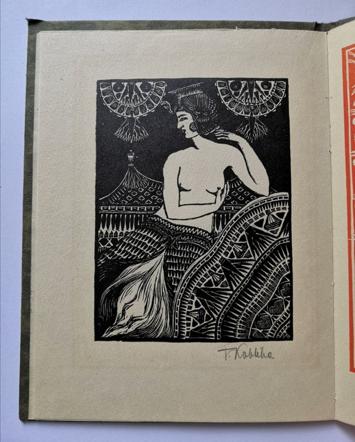 | Ilustrace: | Upravil a dřevoryty vyzdobil František Kobliha: pův. frontispis signovaný tužkou, všechny strany vč. titulní v červeně tištěném ornamentálním rámci. |