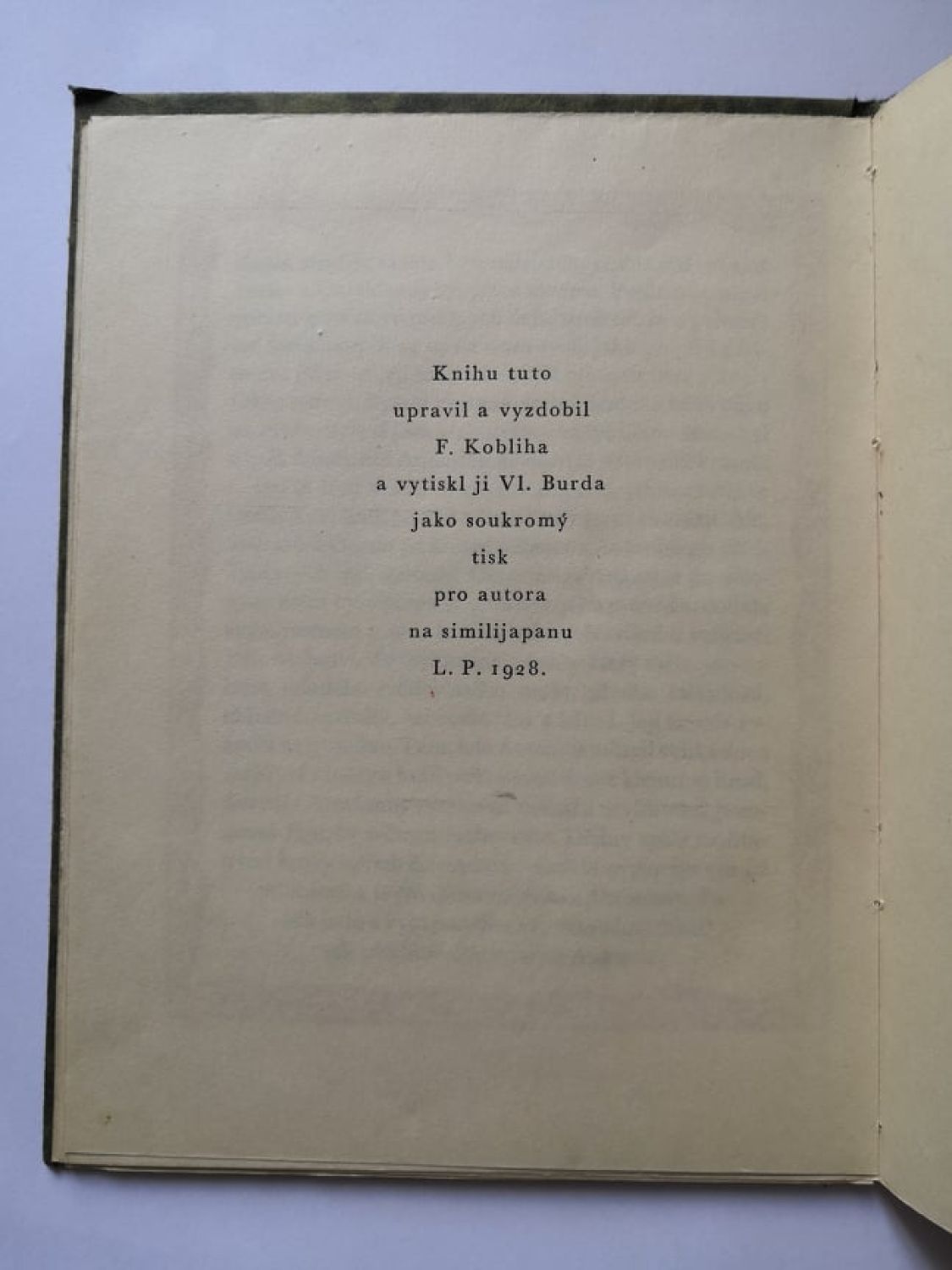 Vytiskl Vl. Burda na similijapanu v neuvedeném počtu výt. - Velmi dobrý stav, na patitulu podpis autora datovaný 3.11.1928.