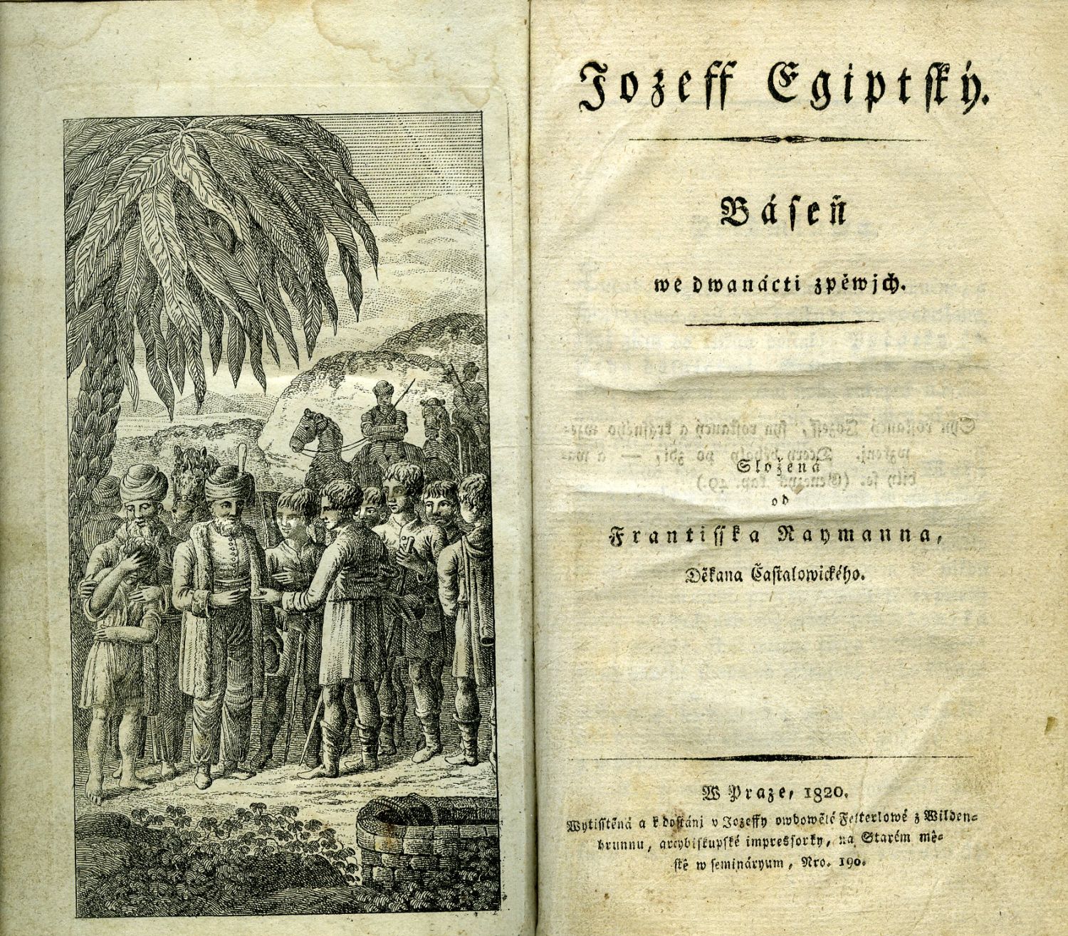 Český text gotikou, , signatury, arabské číslování stran uprostřed horního okraje v kulatých závorkách a mezi pomlčkami, ve front. lept Josefa a jeho bratrů v Egyptě.<br> Nová plátěná vazba potažená škrobovým papírem s ornamentálním dekorem, ochranné kartonové pouzdro, papír mírně zahnědlý, jinak ve stavu dobrém.<br>Jungmann VI, 545. Velmi vzácně se vyskytující dílo Františka Josefa Raymana (1762 Jičín - 1829 Častolovice), katolického kněze a od roku 1800 děkana v Častolovicích, kromě poesie psal také dramata a povídky. Josef Jungmann nabízenou knihu ohodnotil slovy: "Josef Egiptský je plácanina ve verších, pravá hanba literatury; družku té básně novou Toniáše od téhož mazala censura zahubila pro podlost!"<br>..."Jákub pak obláčí se w žízni, jen pláče a wzdychá,