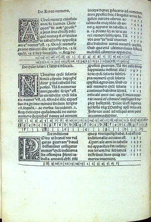 Červeno-černý tisk rotundou, titulní list v dřevorytové borduře zdobené ornamentem, konturové iniciály na ornamentálním pozadí zalomené do výše 6 řádků, na tit. listu do výše 12 řádků. Na foliích b4 verso až b8 recto dvoubarevně tištěné vyobrazení zatmění měsíce a slunce od roku 1483 do roku 1530, astronomické tabulky. Na rubu titulním listu a jeho rubu tištěný pozdrav Regiomontanovi od Johannese Lucilia Santrittera, který zřejmě provedl i redakci vydání kaledáře. K vydání připravil Jacobus Sentinus. Na foliích c8-c12 4 celostr. dřevoryty v jednoduchém rámu s geometrickými vyobrazeními.