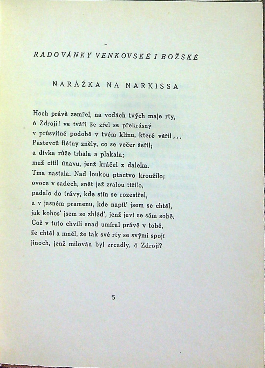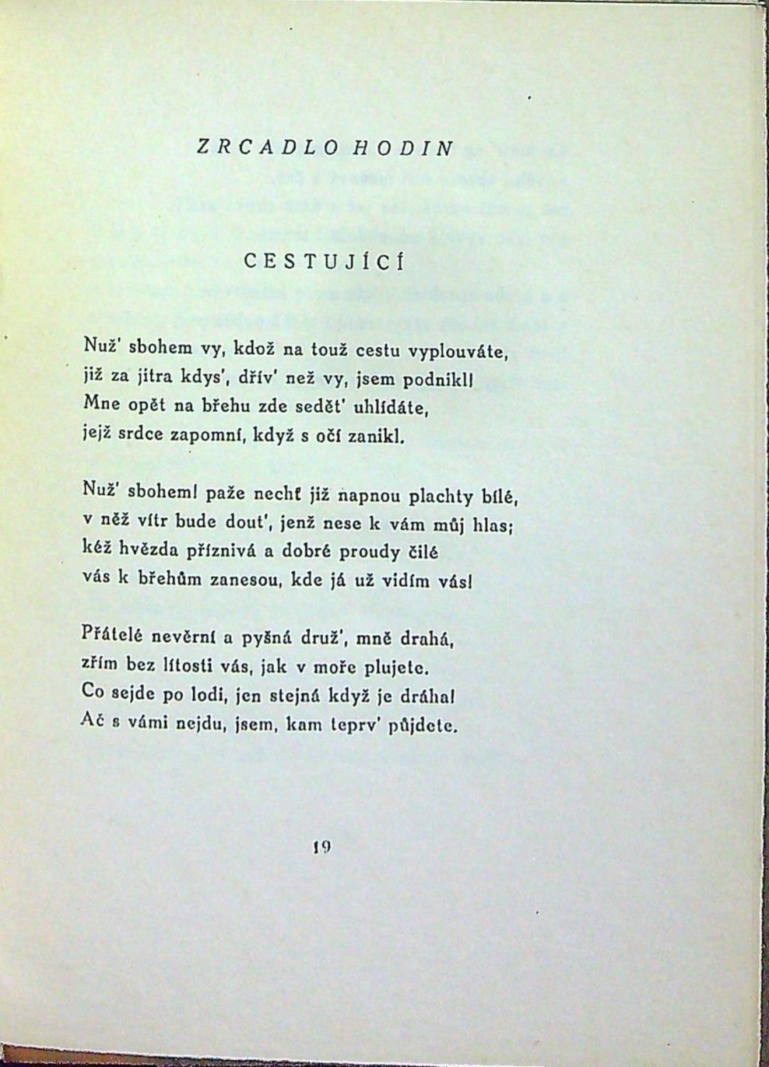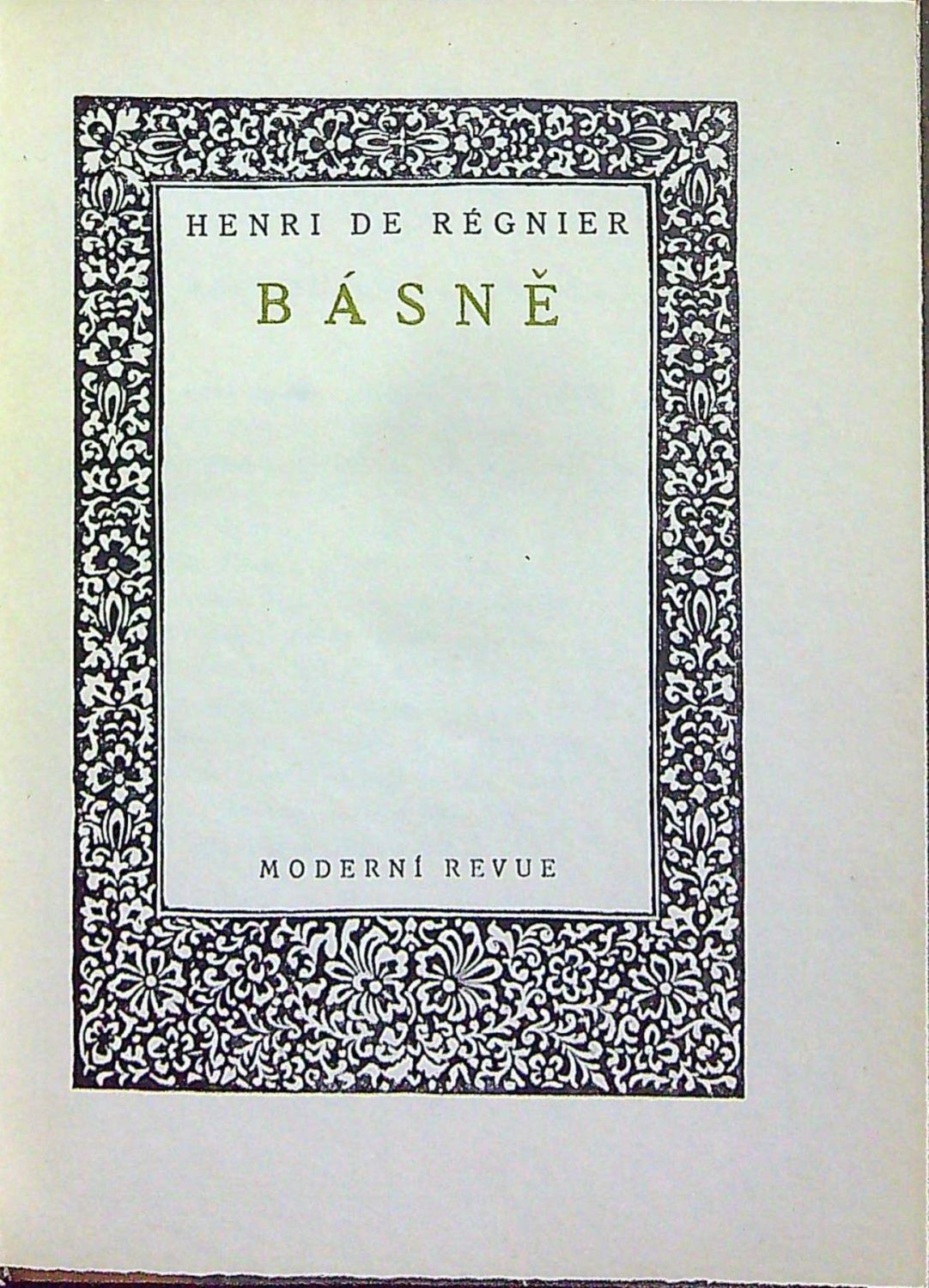 Ex. č. 67 z 200 vydaných. Titulní list a nakladatelské údaje v dřevorytovém rámu Miloše Klicmana, který knihu též upravil, písmem "saeculum" vytiskla tiskárna Josefa Skaláka na americký ruční papír. - Dobová kartonová vazba s tlačenou ozdůbkou na přední desce, ve hřbetu dobový kožený štítek s tlačeným a zlaceným jménem autora, přední strana původní pap. obálky vevázána. Na předtitulu stará vlastnická značka "BTM".
