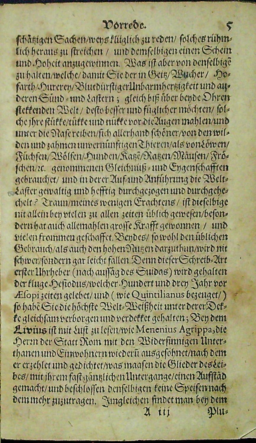Tištěno švabachem, živá záhlaví, vstupní iniciála propletená úponky ve výši 6 řádků, plné iniciály ve výši 2-3 řádků, viněty, tiskařské ozdůbky.<br>Dobová pergamenová vazba, zašpiněná, místy odřená a při vnějším okraji potrhaná, též při spodním okraji hřbetu potrhaná, na předním přídeští rkp. poznámka perem z roku 1884 a novější záznam tužkou od Jiřího Šalamouna s údaji o vydání knihy, na foliu A-II vlastnický přípis z roku 1718 "Wilhelmus Jacobus Mullerus". Titulní list chybí (nahrazen digitální kopií - na jejím rubu podpis Jiřího Šalamouna tužkou). Chybí strana 151-152 a poslední čistý list. Strana 67 v horní třetině utržená od knižního bloku, strana 177-178 při horním okraji lehce proděravělá, strany 185-196 při vnějším okraji lehce pomačkané. Papír zahnědlý. - Druhé Wildeho vydání populárních příběhů o lišáku Reynardovi, které vznikaly ve Francii již od 12. století a knižně byly vytištěny poprvé v anglickém jazyce roku 1481. V této barokní zveršované podobě vyšlo německy poprvé roku 1650 a v tomto vydání bylo rozšířeno o řadu veršů.