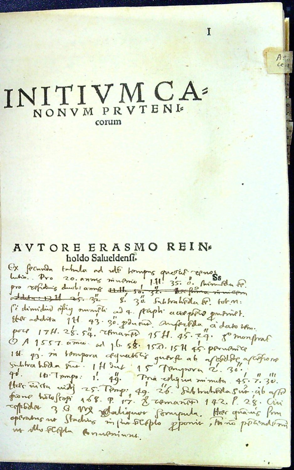 Červeno-černě tištěný hlavní titulní list, tištěno antikvou, řecký text alfabetou, tištěné poznámky po stranách. Kniha se skládá ze tří částí, každá se samostatným tit. listem a vlastní paginací listů, ve třetí části 10 podtitulních listů. V první části konturové iniciály v jednoduchém rámečku na ilustr. pozadí zalomené do výše 5-7 řádků, viněta na tit. list první části, dvě rozkládací tabule. Chyby v paginaci. <br>Pergamenová vazba z atelieru Krupka, ochranné dvoudílné kartonové pouzdro potažené mramorovaným papírem a pouzdro z kartonu. Řada rukopisných marginálií černým perem latinským a místy řeckým jazykem z konce 17. a počátku 18. století se vztahem k textu. Folia 77-80 ve třetí části jsou vevázána mezi folia 84-85. Velmi vzácné první vydání. Ve stavu velmi dobrém.<br>Erasmus Reinhold (22.10. 1511 Saalfeld - 19.2. 1553 Saalfeld), byl německý astronom a matematik považovaný za nejvlivnějšího astronomického pedagoga své generace. Roku 1536 byl jmenován profesorem vyšší matematiky na universitě ve Wittenbergu, kde později také působil ve funkci rektora. - Nabízená kniha je v Čechách a na Moravě pouze v jediném exempláři v NK ČR v Praze. který pochází z osobní knihovny Tychona de Brahe.