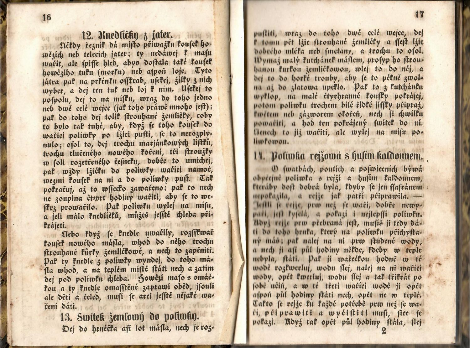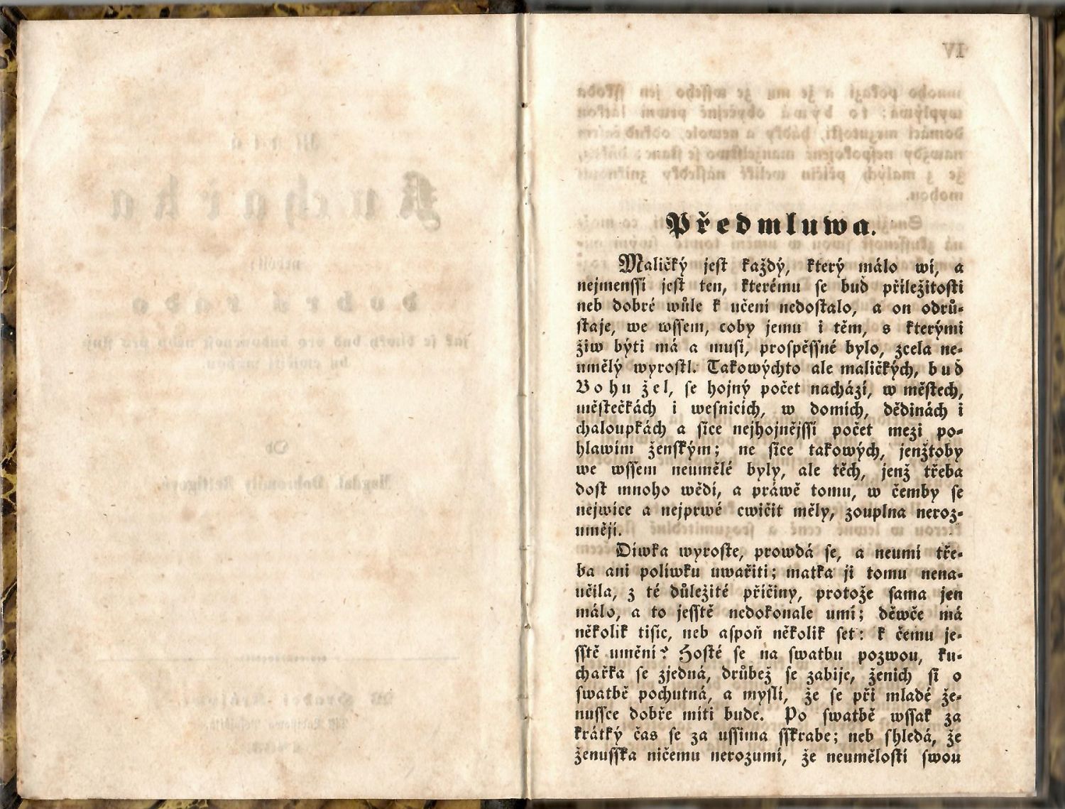 Tištěno švabachem, prvních deset stran paginováno římsky. - Dobová vazba s kartonovými deskami potaženými mramorovaným papírem, plátěný hřbet, při horním okraji hřbetu přelepen pap. štítek z konce 19. století, na předním přídeští perem napsané jméno prvního vlastníka knihy "Josefa Šplíchala". Papír místy lehce zahnědlý, tu a tam drobné světle hnědé skvrnky.