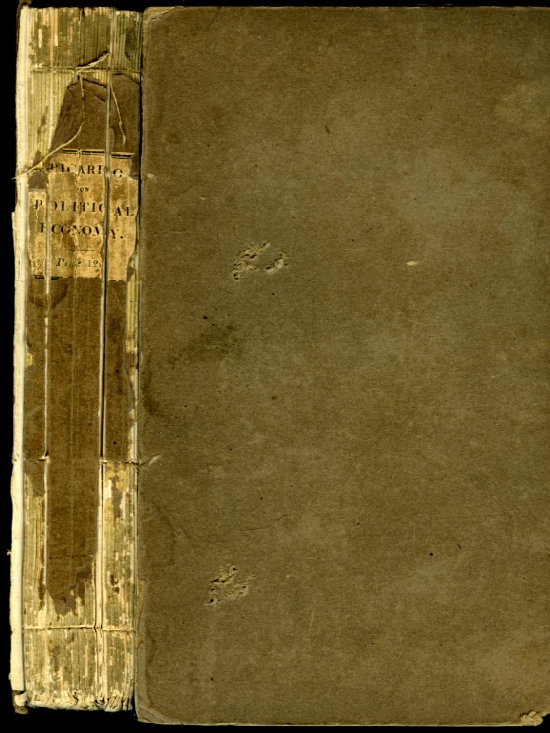 Obě desky odtržené a odřené, hřbet s torsem papírového pokryvu a štítku popraskaný, knižní blok rozpadlý, listy pomačkané; přední předsádka proděravělá, její horní roh odstřižený, uvolněný tit. list natržený. - Třetí a nejlepší vydání, vzácnější než obě předchozí (1817 a 1819), tohoto hlavního díla národohospodářského klasika D. Ricarda (1772-1823), poslední za jeho života a předloha prvního německého z téhož roku. Autor v něm podnikl podstatnou textovou revizi: první kapitola uvádí mnoho nového materiálu k thematu "hodnota", poprvé je zde kapitola o technice (Machinery), poslední kapitola obsahuje nové názory na daně, státní dluh aj.