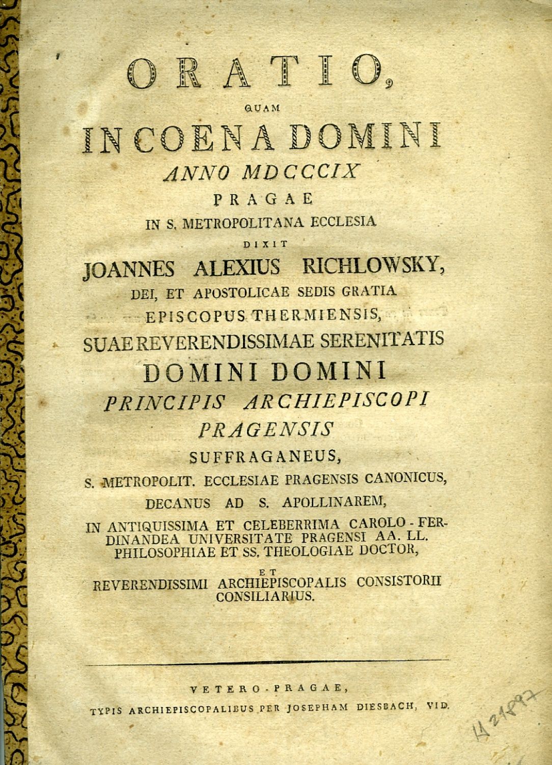 ORATIO, QUAM IN COENA DOMINI ANNO MDCCCIX PRAGAE IN S. METROPOLITANA ECCLESIA DIXIT JOANNES ALEXIUS RICHLOWSKY, DEI, ET APOSTOLICAE SEDIS GRATIA EPISCOPUS THERMIENSIS, SUAE REVERENDISSIMAE SERENITATIS DOMINI DOMINI PRINCIPIS ARCHIEPISCOPI PRAGENSIS SUFFRAGANEUS, S. METROPOLIT. ECCLESIAE PRAGENSIS CANONICUS, DECANUS AD S. APOLLINAREM, IN ANTIQUISSIMA ET CELEBERRIMA CAROLO-FERDINANDEA UNIVERSITATE PRAGENSI AA. LL. PHILOSOPHIAE ET SS. THEOLOGIAE DOCTOR, ET REVERENDISSIMI ARCHIEPISCOPALIS CONSISTORII CONSILIARIUS.