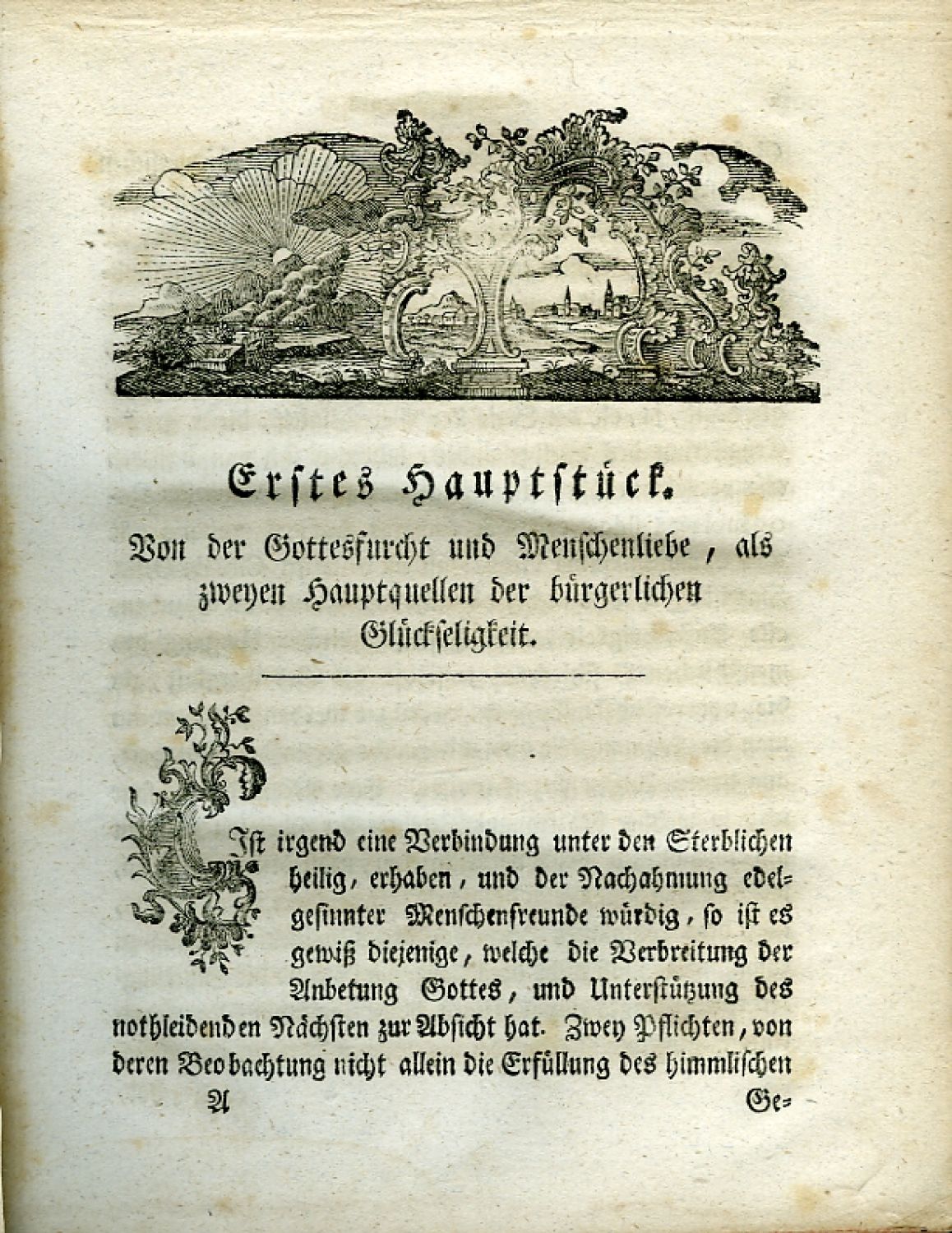 Knihopis 14843<br>Německý a český (s. 77-81) text gotikou, latinský antikvou, signatury, stránkové kustody, arabské číslování stran při horním vnějším okraji, uprostřed horního okraje stran ozdobná rokoková linka, rokokové viněty, na první straně rokokový vlys (krajina se zapadajícím sluncem, v pozadí město, vpředu rokajová architektura), ozdobné konturové iniciály s rostlinným dekorem ve volném prostoru ve výši 2-5 řádků, plné iniciály ve volném prostoru ve výši jednoho až dvou řádků, některé zčásti zarámované rokokovými dřevořezy. - Dobová kartonová vazba s deskami potaženými škrobovým papírem, ve hřbetu dva vazy, hřbet je rozčleněný do 4 polí od sebe oddělených dvojitou ozdobnou linkou, v jednotlivých polích tlačené zdobné ornamenty, červeně barvené ořízky. Vazba ohmataná a místy vyšisovaná, při horním okraji hřbetu natržený papír, při spodním jeho okraji podélně mírně natržený papír, naražené rohy, při horním vnějším okraji na obou deskách natržený papír. Titulní list a frontispis zahnědlý, frontispis v horní části přeložený (přesahoval by přes rozměr knižního bloku) a přeložená část je při vnitřním okraji oříznutá po rámeček rytiny.<br>Pietro Rigetti byl okolo roku 1773 sekretářem vlašské kongregace a hospitálu v Praze na Malé Straně a nabízené dílo bylo vydáno k oslavě založení vlašské kongregace a špitálu u sv. Karla Boromejského v Praze.
