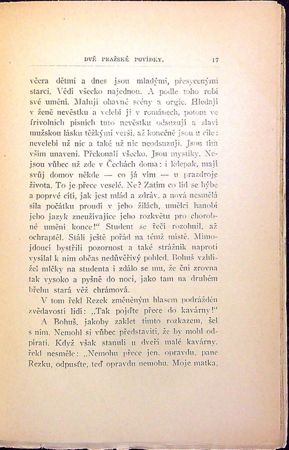 Do českého jazyka přeložil Jan Löwenbach. - Původní pap. obálka, přední strana dvoubarevně tištěná s ilustrací neurčeného autora, na přední straně obálky razítko "Premie Zlaté Prahy a Světozoru". Knižní blok neoříznutý a nerozřezaný.