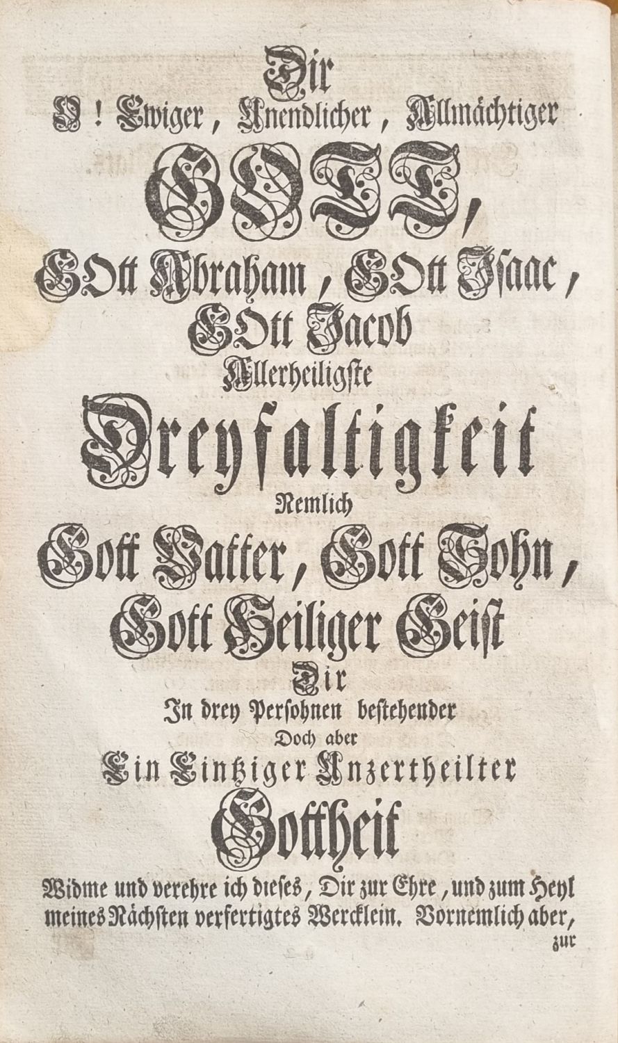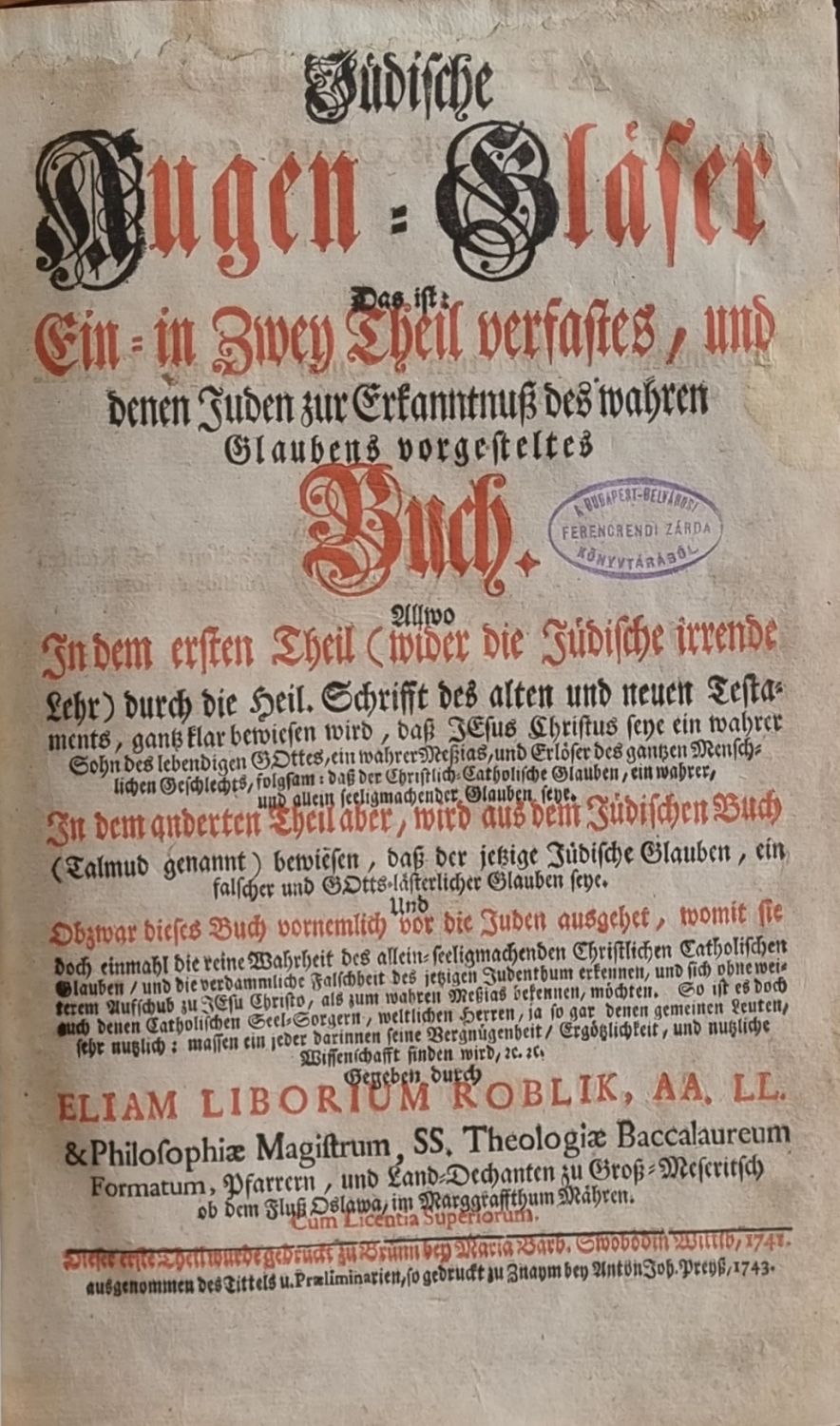 Pumprla I, 3895; Dokoupil, Brněnské tisky 1741 č. 9; BCBT 04925<br>Tištěno frakturou, latinské poznámky antikvou, živá záhlaví od sazby oddělená jednoduchou linkou, červeno-černě tištěné titulní listy. U prvního dílu v impresu na tit. listu pod údajem o brněnském tisku a dataci 1741 tištěný údaj "ausgenommen des Tittels u. Praeliminarien, so gedruckt zu Znaym bey Anton Joh. Preyß, 1743". Tisk ve dvou sloupcích, pásové vlysy z ornamentů, s ilustracemi, zdobné tyče z drobných ornamentů, viněty. Plné iniciály s ornamentální výzdobou zalomené do výše 2-6 řádků, versálky zalomené do výše 2 řádků. V prvním dílu předtitul se zkráceným názvem a do mědi rytými brýlemi, za titulním listem 1. dílu celostr. mědirytina s vyobrazením židovského učence sedícího u stolu, v pozadí dva muži v okovech, vpravo nahoře ruka boží s váhami, v rytině různě rozmístěné citáty ze SZ. Za foliem a4 mědirytina s vyobrazením fontány a z ní se napájejících ovcí, ve spodní části v kádích zvířecí monstra, v rytině rozmístěné citáty ze SZ. Mezi stranou 44-45 1. dílu mědirytina se schematickým vyobrazením trojjediného Boha, doprovodným textem a citátem z Izajáše. Ve druhém dílu za foliem A2 mědirytina pře dva listy mědirytina s vyobrazením Adama a Evy u Stromu poznání, ukřižovaného Ježíše a protižidovsky laděnými vyobrazeními (ukřižovaného hada a zesměšněním Talmudu, který je zobrazen jako sud s vínem, do kterého tekutinu dáví dva draci), doplněno účelově vybranými citáty ze SZ.<br>Dobová vazba z hnědé hověziny, barvené ořízky, ve hřbetu 5 vazů, ve druhém poli původní kožený štítek s názvem. Vazba ohmataná a odřená, místy chybí kožený pokryv, přední deska zčásti uvolněná od hřbetu, naražené rohy, při horním i spodním okraji hřbetu chybí kousky kůže. Na titulním listu staré razítko "Rerenorendi Zárda Budapest-Belvárosi ...". <br>Eliáš Libor Roblik (29.1. 1689 Křečkovice - 1.11. 1765 Vídeň), moravský katolický kněz, který nakonec opustil duchovní stav. V letech 1732-1748 byl děkanem ve Velkém Meziříčí. Ve své knize se pokouší odradit Židy od jejich víry za pomoci různých, mnohdy i velmi kuriosních argumentů podložených účelově vybraných starozákonních citací.