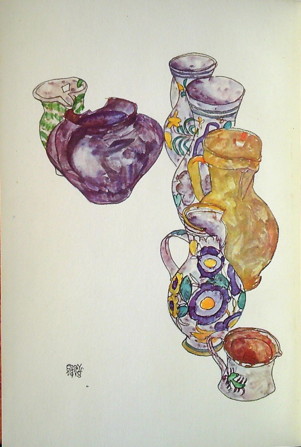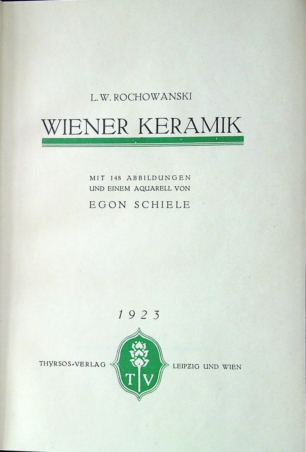 Ve front. barevná reprodukce akvarelu E. Schieleho, na straně 7-26 text nahoře a dole olemovaný trojitou jednoduchou linkou, na stranách 29-171 142 černobílých fotografických vyobrazení keramických prací předních vídeňských tvůrců (Michael Powolny, Julia Sitte, Victor Lurje, Dagobert Peche, ...). Na patitulu podpis autorův perem datovaný ve Vídni v září 1932.<br>Původní kartonové desky potažené škrobovým papírem s ilustrací na přední desce, plátěný hřbet.<br>Leopold Wolfgang Rochowanski (3.8. 1888 Zuckmantel/Zlaté Hory ve Slezsku - 13.9. 1961 Vídeň), spisovatel, básník, novinář, výtvarný kritik a historik umění. Od roku 1921 pracoval pro Prager Presse, v letech 1923/24 byl vedoucím redaktorem nakladatelství Thyrsons. V čase národního socialismu v Rakousku nesměl publikovat, po válce založil nakladatelství Agathon Verlag a k 80. narozeninám architekta Josefa Hoffmanna vydal pamětní publikaci.