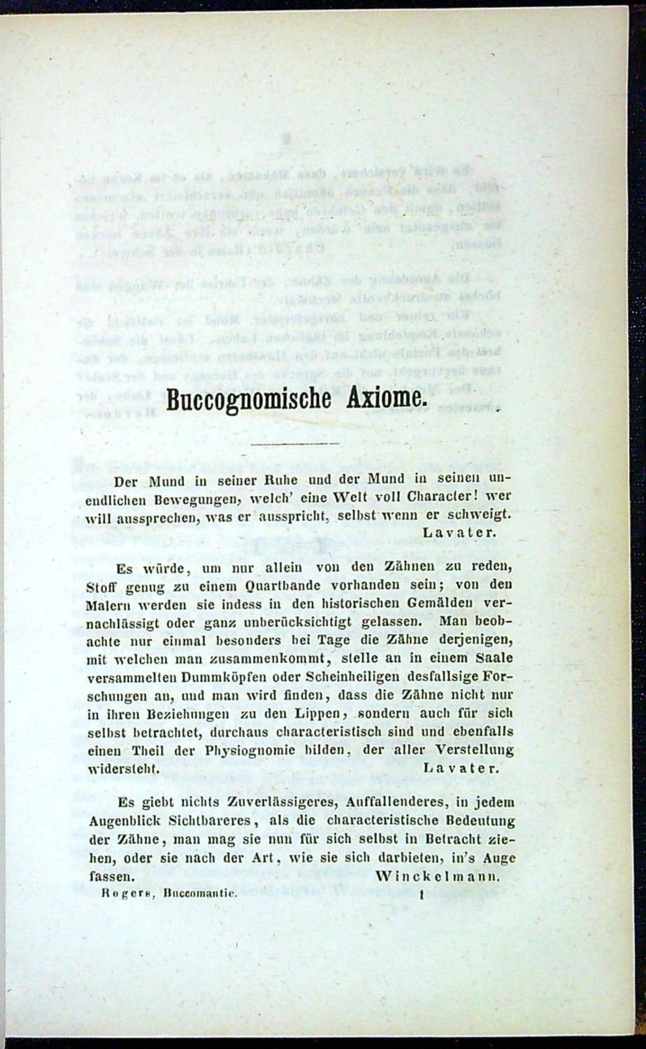 Die Buccomantie, oder die Kunst, nach dem Munde un die Zähnen, deren Bildung und Beschaffenheit, Die Gesinnungsart eines Menschen zu erkennen und ihm wahrzusagen. Auf die Grundlehren der berühmtesten Physiognomen, hauptsächlich aber auf die Entdeckung characteristischer Offenbarungsmerkmale des menschlichen Mundes basirt und die Glaubwürdigkeit derselben thatsächlich an einer grossen Anzahl zum Theil berühmter und nach lebender Personen dargethan.