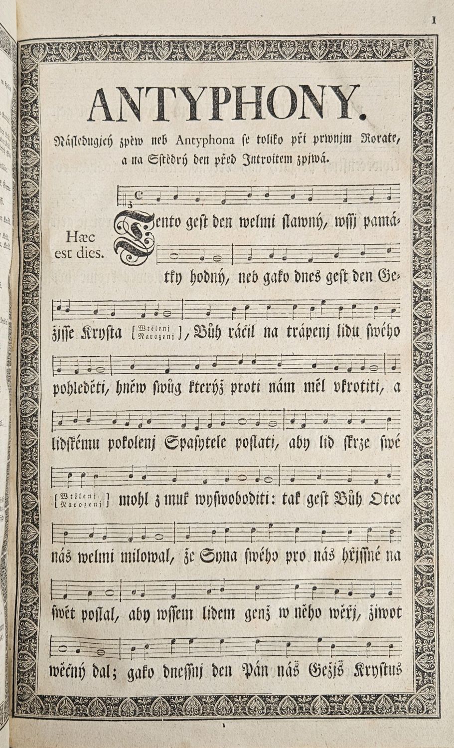 Tištěné švabachem, latinská slova antikvou, plné iniciály propletené úponky zalomené do 2 řádků, strany jsou olemované xylografií tištěným rámem zdobeným ornamentem, při okraji listů s počátky jednotlivých rorátů nalepeny pap.záložky. Na listu za listem titulním seznam abonentů knihy, průběžná notace.<br>Kartonové desky potažené mramorovaným papírem, plátěný hřbet a nárožnice. Plátno při spodním okraji hřbetu natržené, desky místy lehce odřené, naražené rohy. Chybí strany 65-68. Strana 65 kaligraficky dopsaná a vložená volně do knižního bloku, strana 68 kaligraficky dopsaná a svázána v knižním bloku, strany 66-67 v knižním bloku svázané a předpřipravené na dopsání.