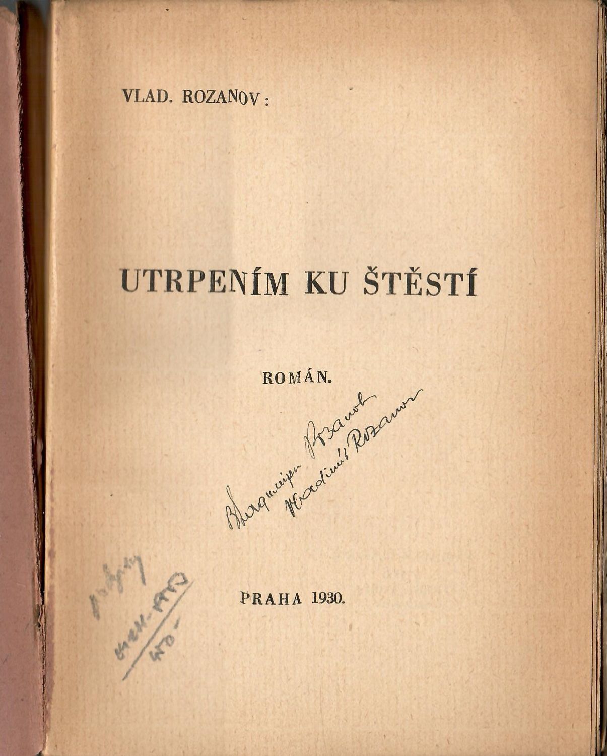 Na titulním listu podpis autora.<br>Papírové desky při okrajích vybledlé a z velké části oddělené od knižního bloku. Okraje listů zažloutlé.